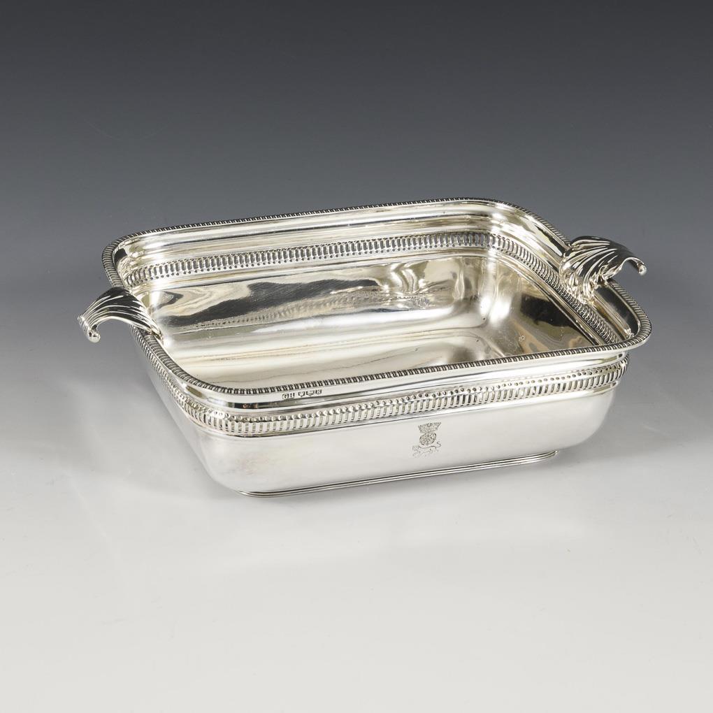 Rectangular bowl with Sheffield rose engraved on the front, crown and striding lion.
