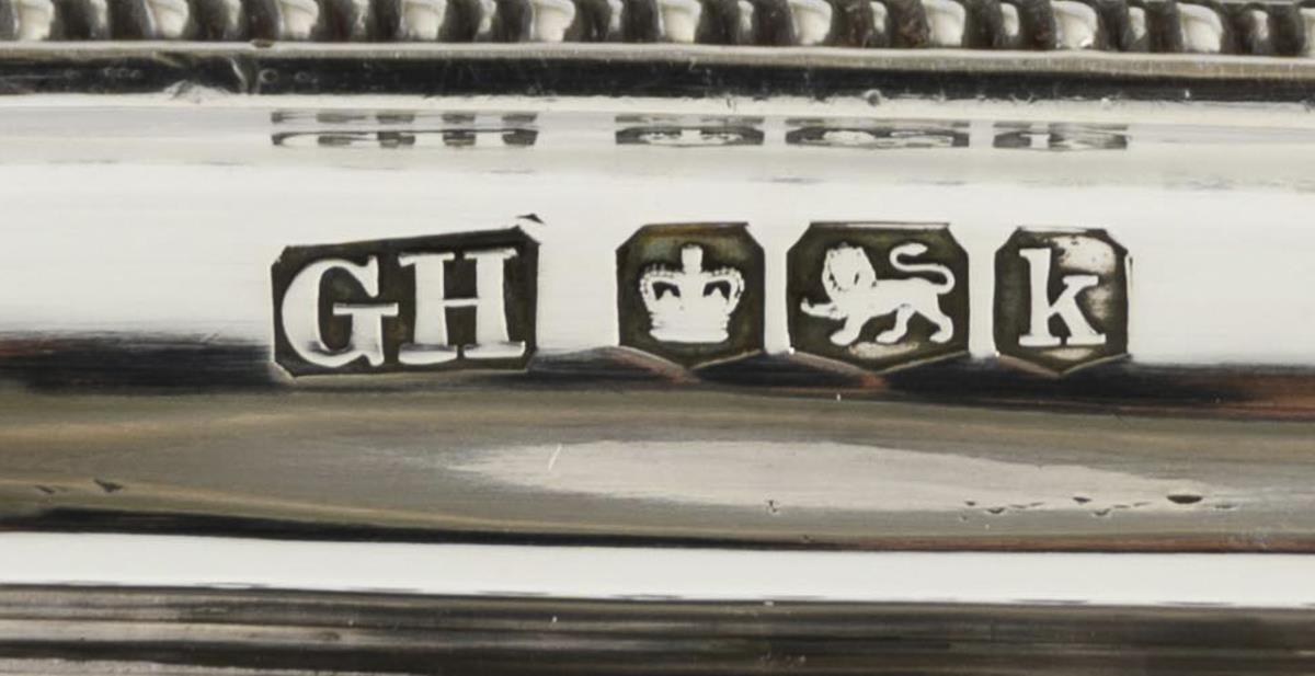 Rectangular bowl with Sheffield rose engraved on the front, crown and striding lion.