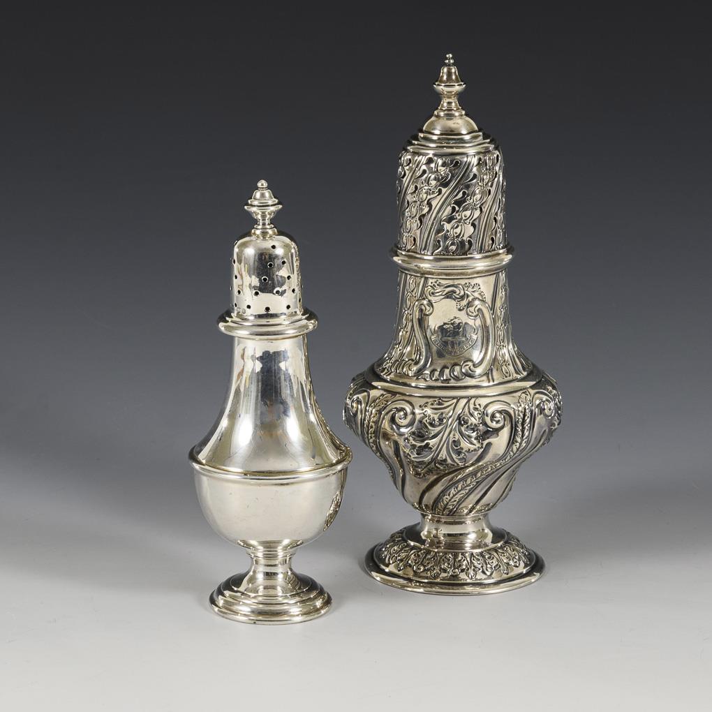 1x richly relieved (h 22.5 cm), 1x smooth baluster form (h 18 cm). Minimally dented.