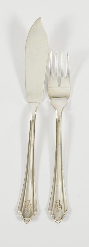 Fanned handles with monogram "UD": 12 fish forks and 12 fish knives.