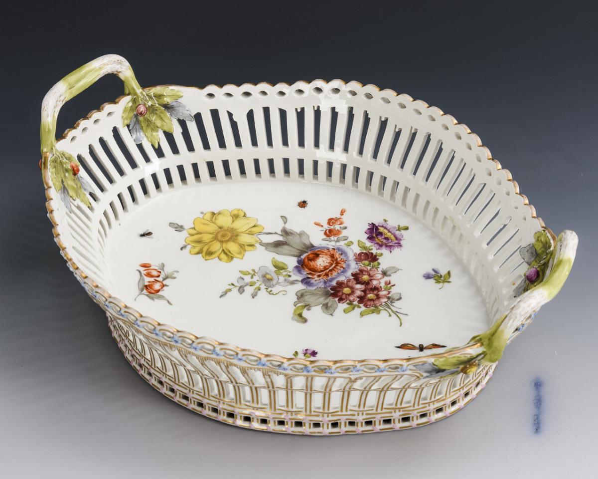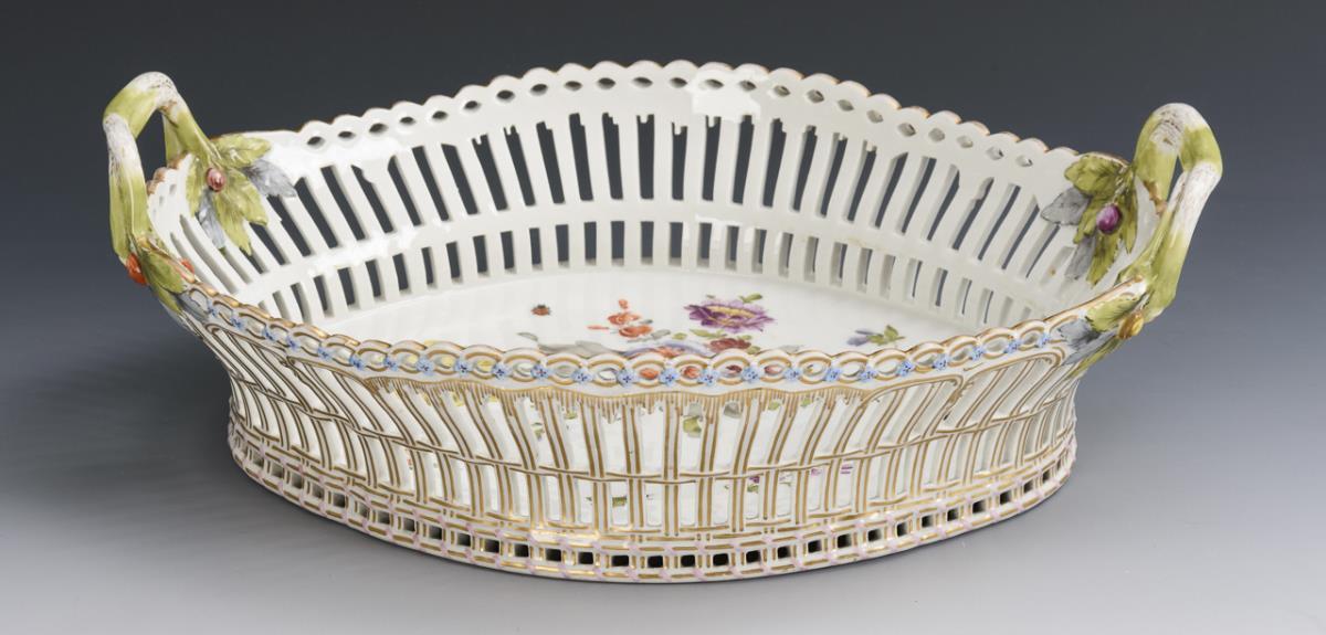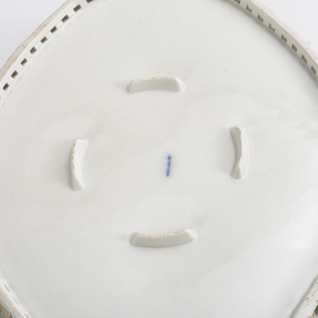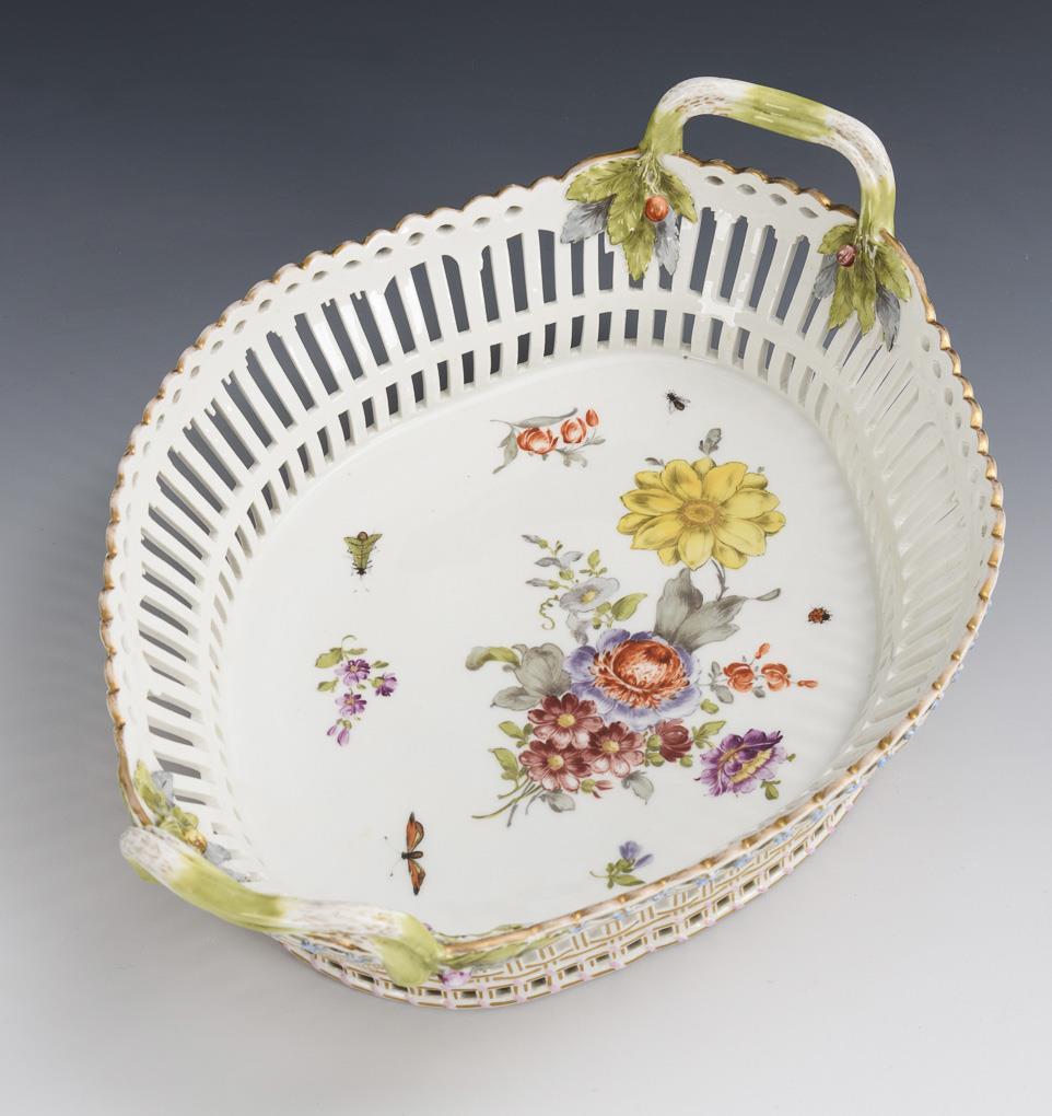 Oval basket with staff opening and two branch handles, in the mirror floral and insect painting. Partial gold rubbing.