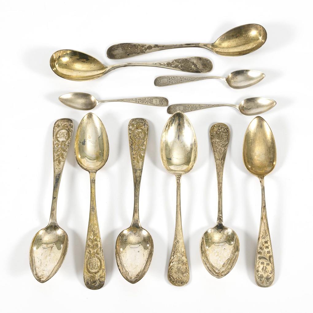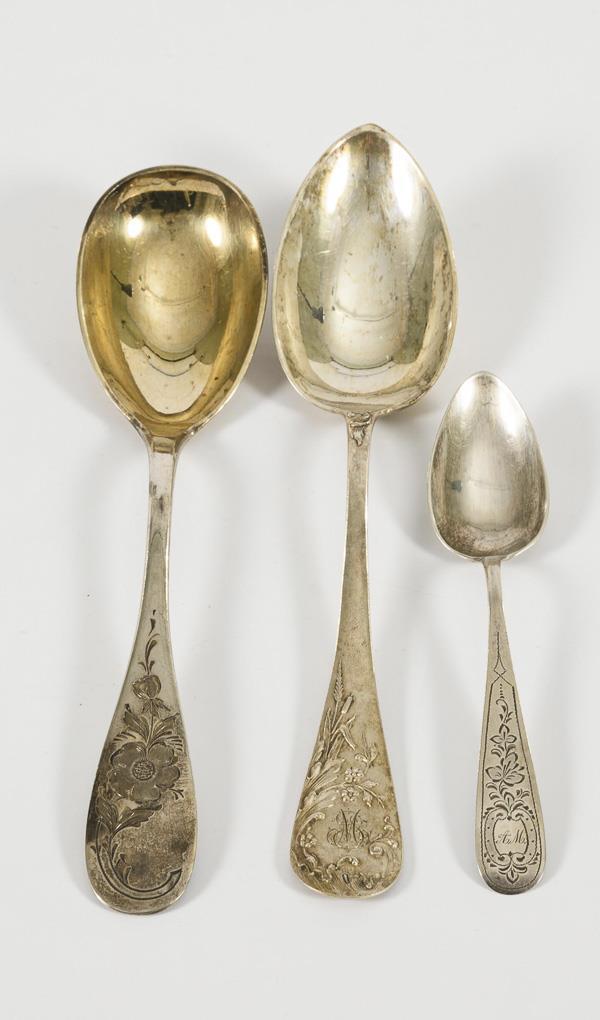 Silver 2-piece salad servers and 3 + 2 silver soup spoons. Plus silver plated soup spoon and 3 coffee spoons. Slight signs of age.
