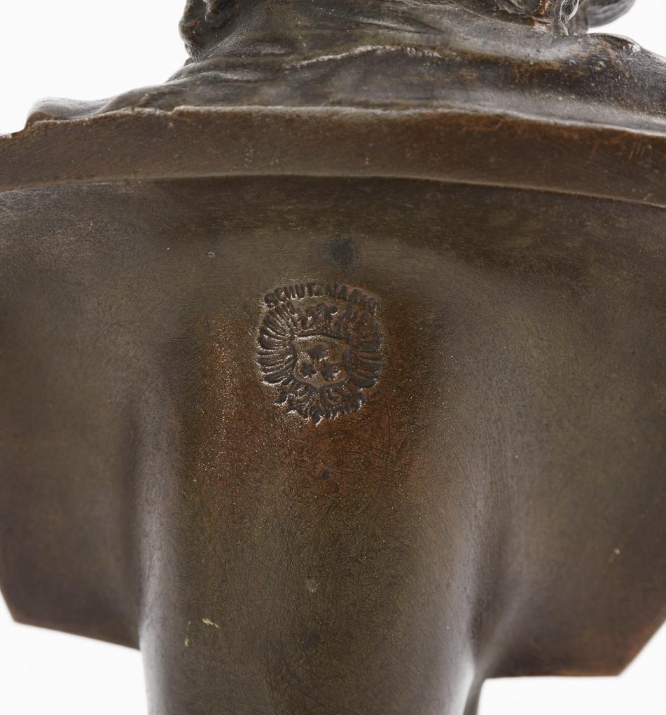 Cast metal bronze patinated, red marble base. Eagle guard mark with coat of arms breastplate. H 17,5 / 28 cm.