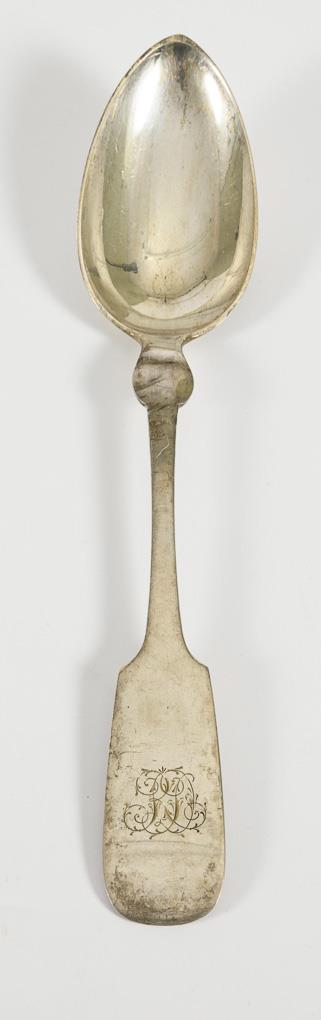 Biedermeier spade form: 6+ 6 silver spoons with intertwined monogram engravings. Marks of age.