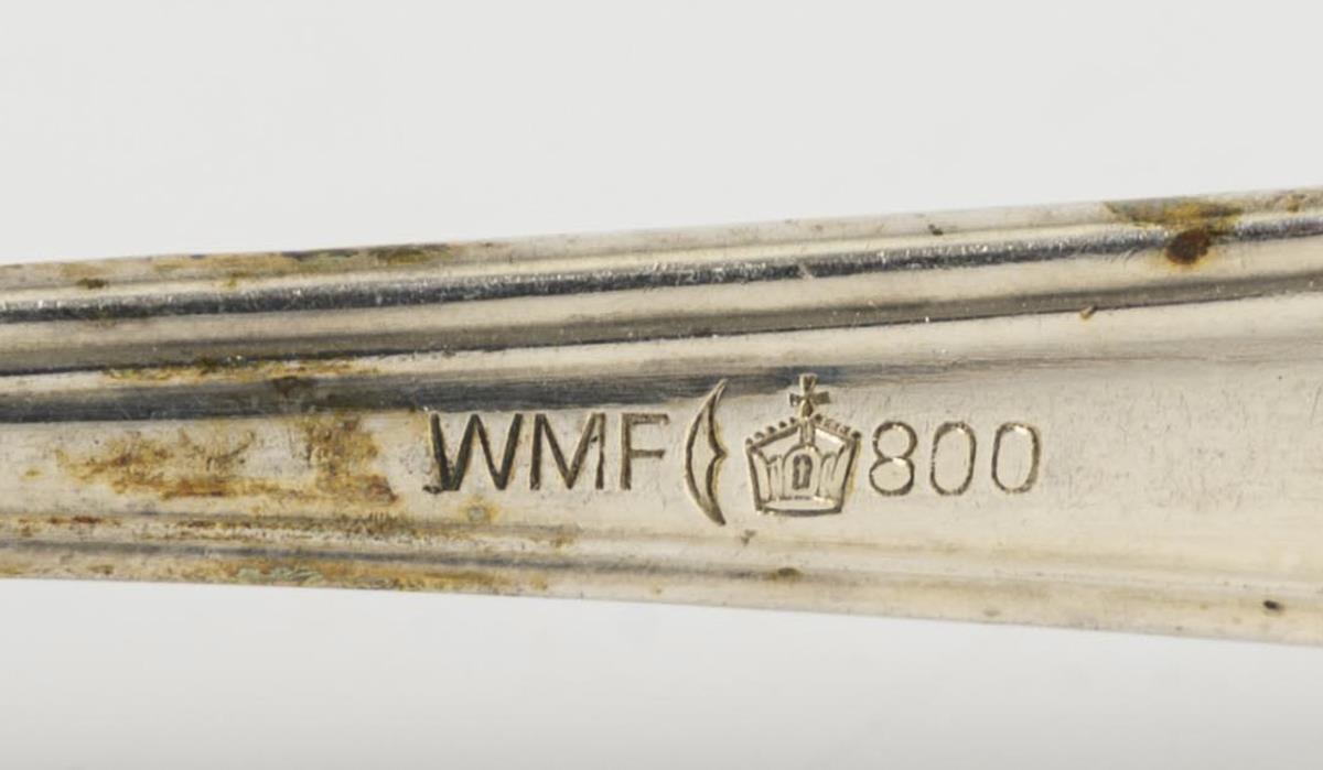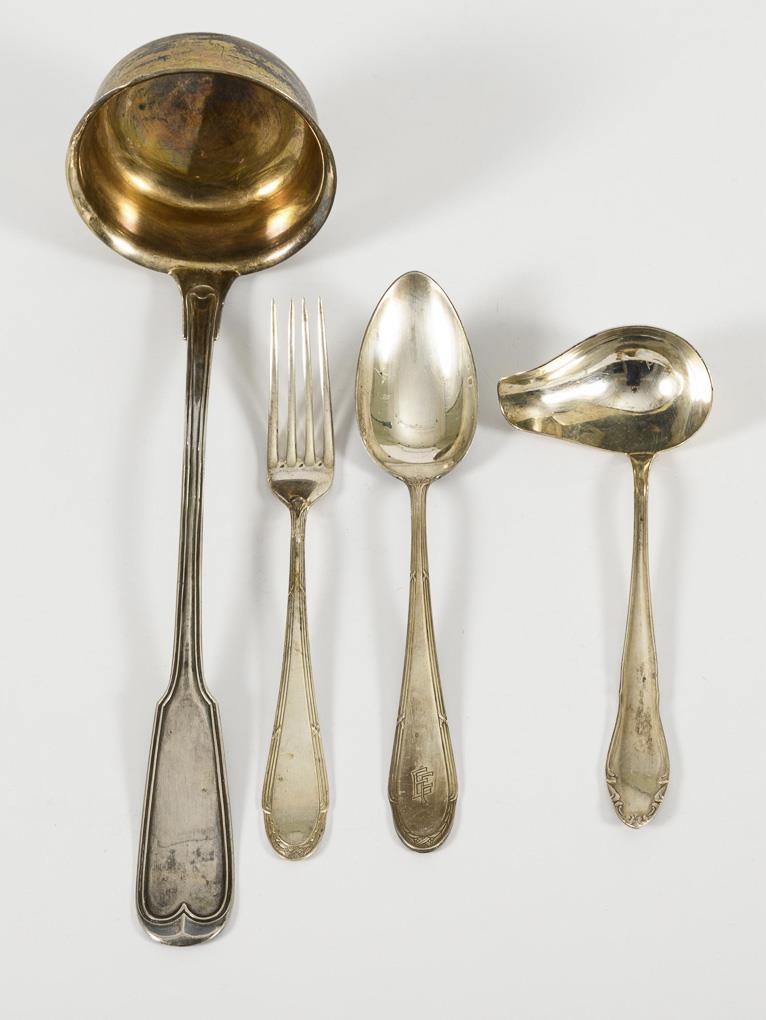 Large silver soup ladle and small silver sauce ladle. Plus 5 silver dinner forks WMF and 5 silver plated soup spoons WMF with cross ribbon decoration. Slight signs of age and use.