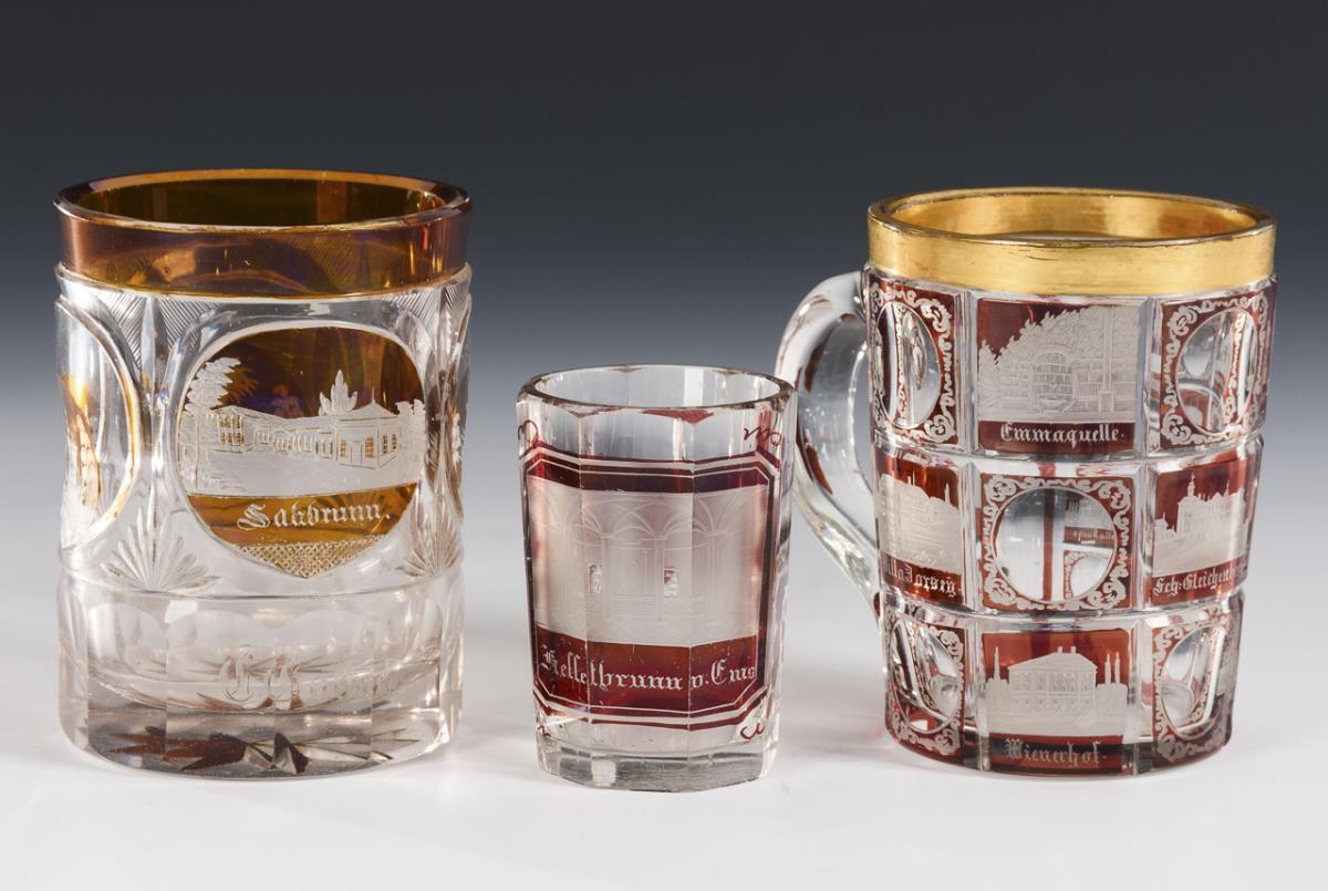 Various glasses with engraved views (including Teplice, Luhakovice, Salzbrunn). Gold rubbed, 1x rim abraded, 1x bumps on stand, 1x minimal rim bump.