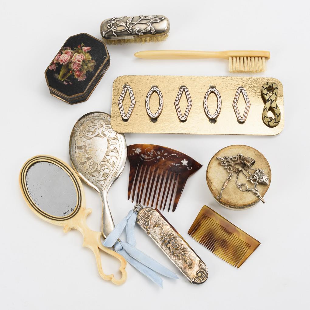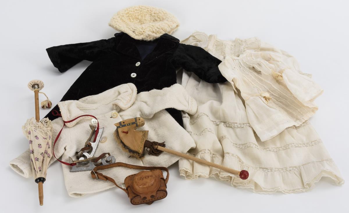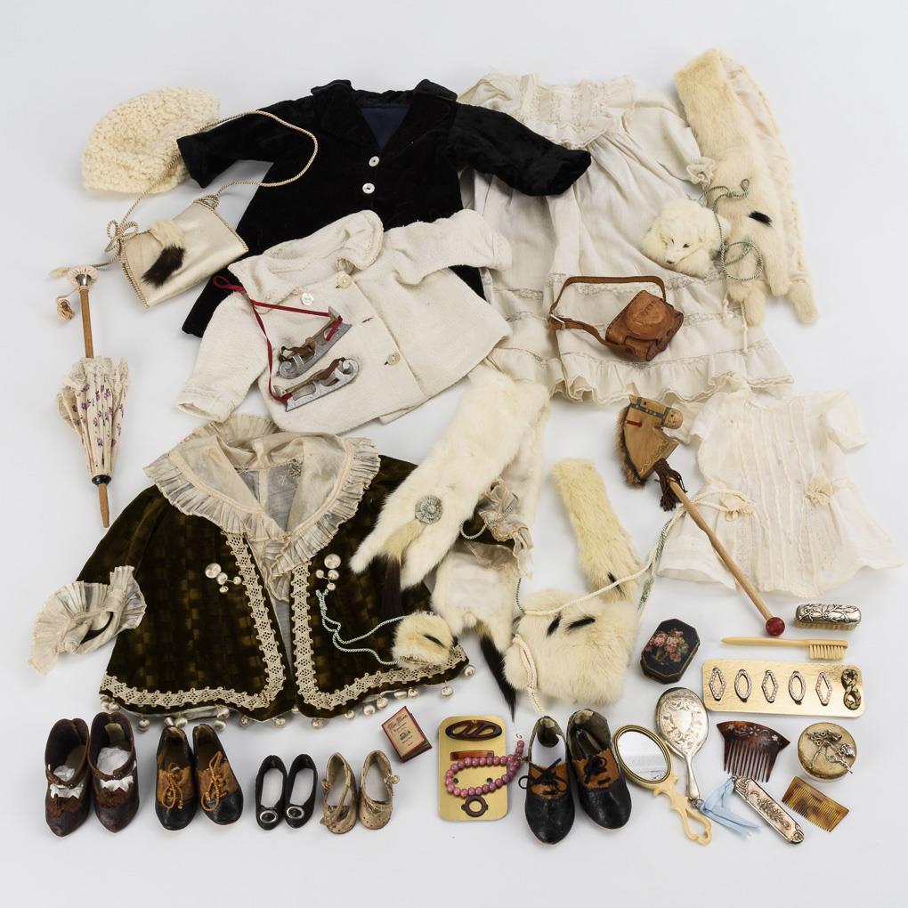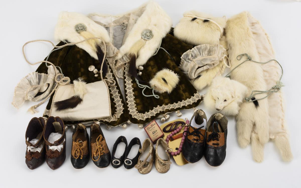 Approximately 11 pieces of clothing: 6 pieces of white fur (collars and muffs), 3 coats and 2 dresses. In addition, 5 pairs of doll shoes, parasol, mini camera, hair ornaments etc. Parts with defects.