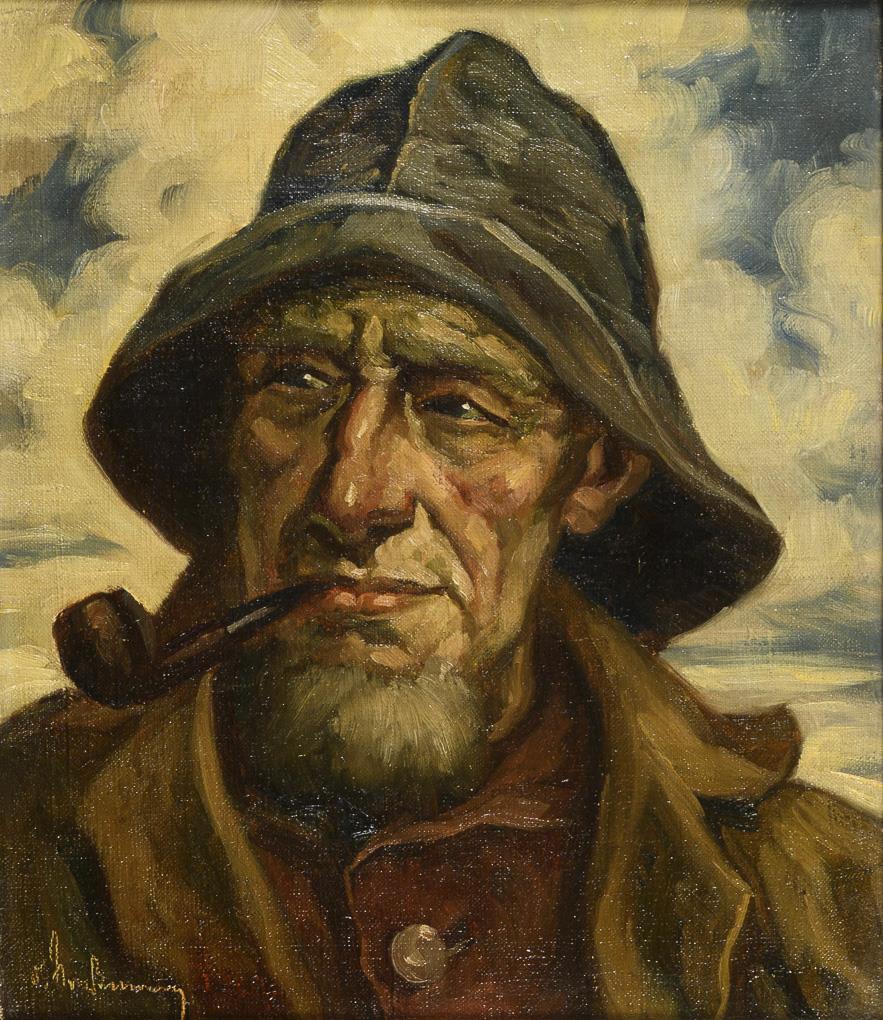 Portrait of a man with hat and pipe before cloudy sky.