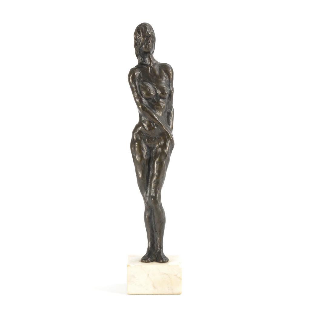 Stand figure of a nude woman. Designed with elongated proportions, minimal chips on the base.