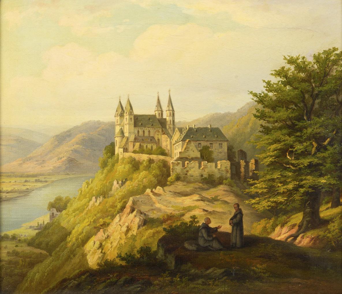 Monks on a mountain near the castle above the river in the sunshine. Slight signs of age.