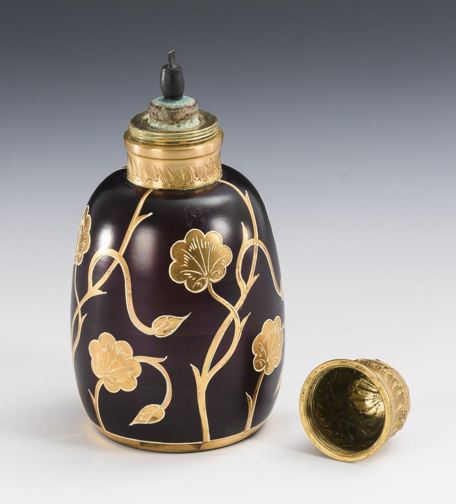 Violet glass with clear glass overlay, frosted etched; with gold floral painting. H 15 cm.