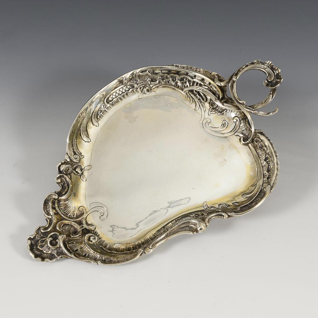 Heavy, asymmetrically designed tray with richly relieved rim and handle. Light signs of use.