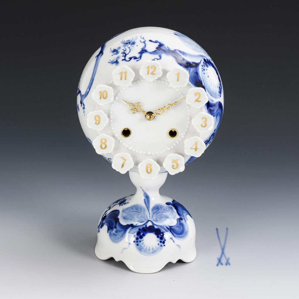 Since the beginnings of the Meissen manufactory, one dealt with the manufacture of clock cases, as evidenced by the extensive collection of the show hall in Meissen. The last great success was achieved by Ludwig Zepner and Heinz Werner with various clocks in the "large cut-out" design. They are relatively rare and are little described in the literature (see Classical Meissen, p. 96, fig. p. 97 and 106, Meissen Porcelain from 1720 to the Present, p. 140). The variant shown here with the decoration "Blaue Orchidee" (Blue Orchid) by Heinz Werner speaks exemplarily for the joy of experimentation and the formal language of the late 1970s. On an organically harmonious base, a perfectly shaped sphere is enthroned on whose flattened side a dial is designed that incorporates both modern and baroque elements. Bold, eccentric, daring ... - Peter Strang succeeds here in making a statement: Meissen design is always on the cutting edge, even more innovative, brash and forward-looking.