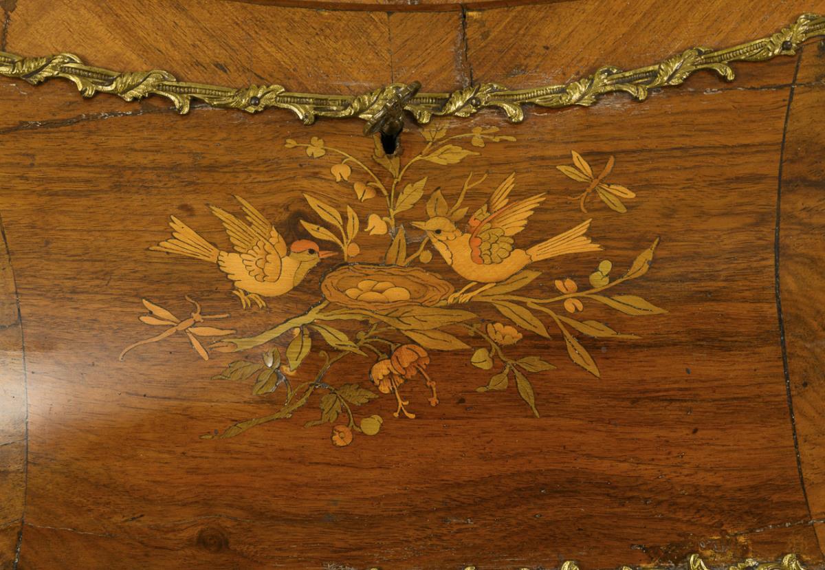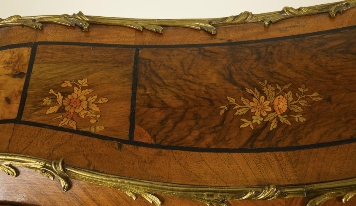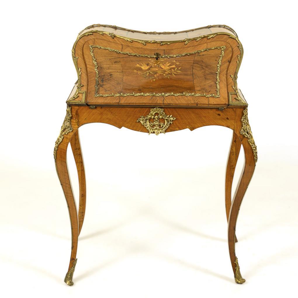 Decorative ladies desk in style-typical curved form with hinged writing top, on 4 flared legs, richly decorated with burl veneer, bird and flower marquetry and lush bronze applications, inside 1 open compartment and 4 small drawers, writing top covered with green velvet. Restored, few signs of age/use, 1 bronze application missing.