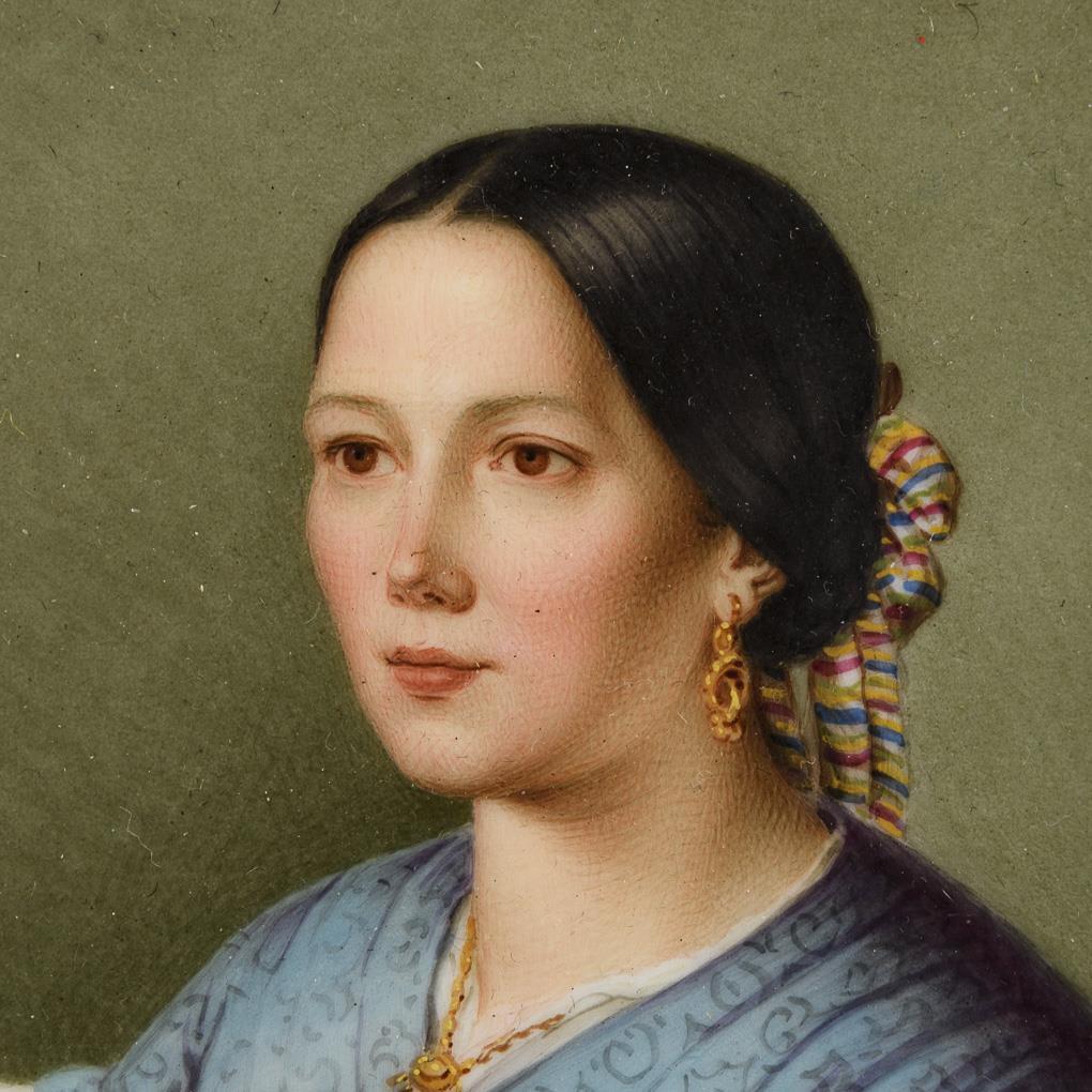 Rectangular plate depicting a seated Biedermeier lady in a blue dress.