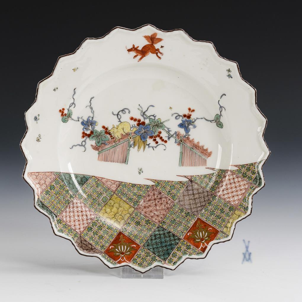 This unusual and imaginatively designed plate thrives on two almost contradictory yet related representations : the graphic geometric arrangement of finely painted squares (checkerboard) and a Kakiemon painting in the white area, also known as "squirrels, vines and brushwood hedge". In the flag of the plate there is another apparently flying animal. The boundary line of both areas resembles the serrated edge of a leaf. Opinions differ about the animals depicted on the plate. Two rodents can be seen. They also entered the porcelain literature as "squirrels snacking on grapes". One (yellow) sits snacking on a bamboo branch and could also be a large mouse. The other hovers on the flag and is reminiscent of a flying squirrel, or perhaps a fox. Originally found on 16th-century Nanking porcelain, this motif was picked up and worked on by Japanese porcelain painters and eventually made its way to Meissen, where it was involved in the Hoym-Lemaire affair (see above, Weber, Meissen Porcelains with Decorations Based on East Asian Models). In Meissen it was perpetuated on bowls, leaf bowls and serrated plates from about 1730. A plate of this type can be found, among others, in the Ernst Schneider collection (Lustheim Palace, Munich). In the inventory catalog of porcelains with decorations after East Asian models in Lustheim Castle, Mrs. Julia Weber has very well elaborated the decor and also forms. A bowl of this type is also kept by the Victoria and Albert Museum, London.
