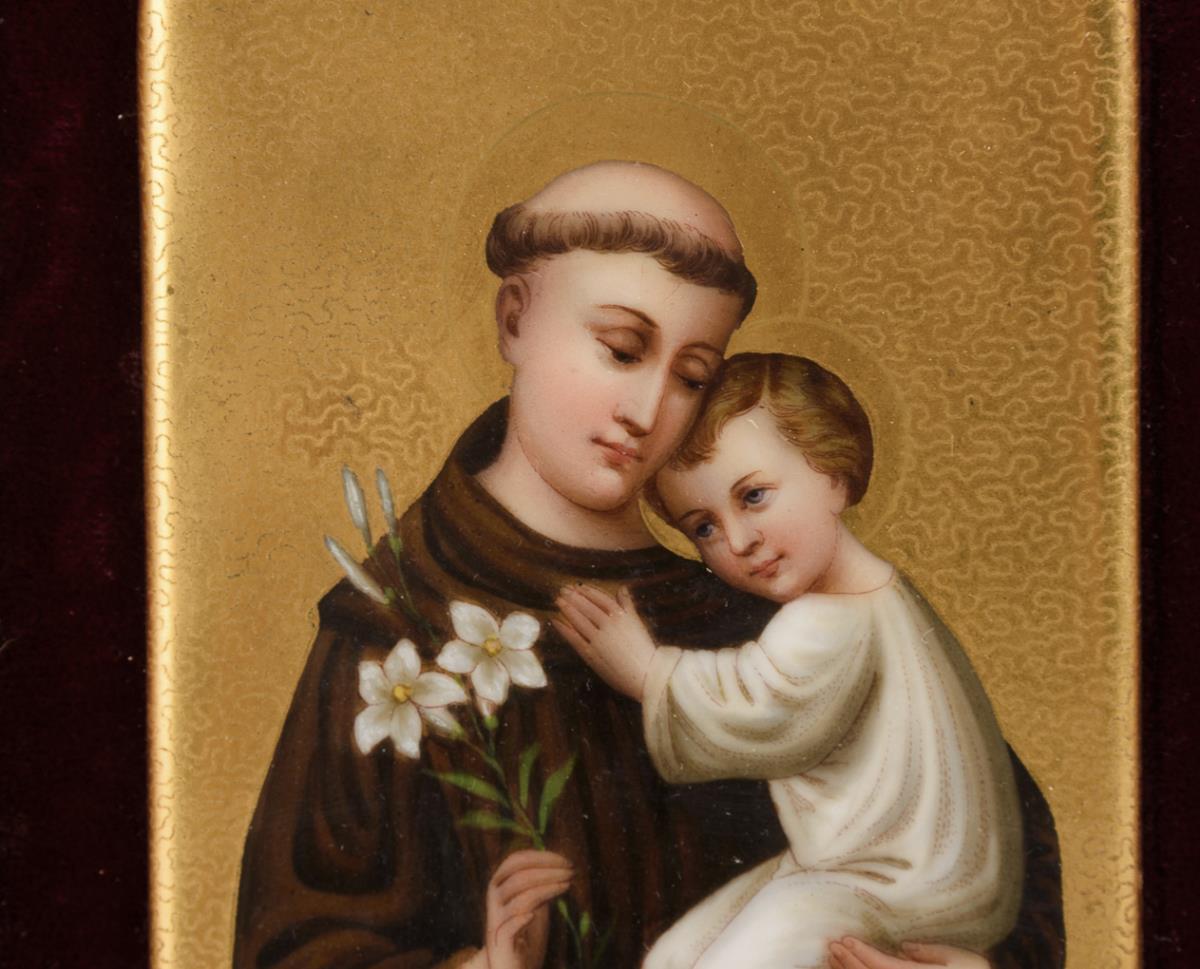 1x oval plate with the painted depiction of Mary Magdalene (L 16.5 cm; blue velvet passepartout and gold-bronzed wooden frame, 33 x 28 cm). / 1x rectangular small plate with the depiction of St. Joseph with Christ boy painted over pre-print (13 x 9 cm, burgundy velvet passepartout, gold-bronzed wooden frame, 21.5 x 16.5 cm). Scratch marks on the plate of the Madonna.