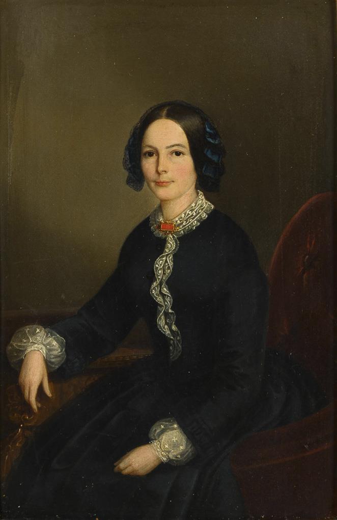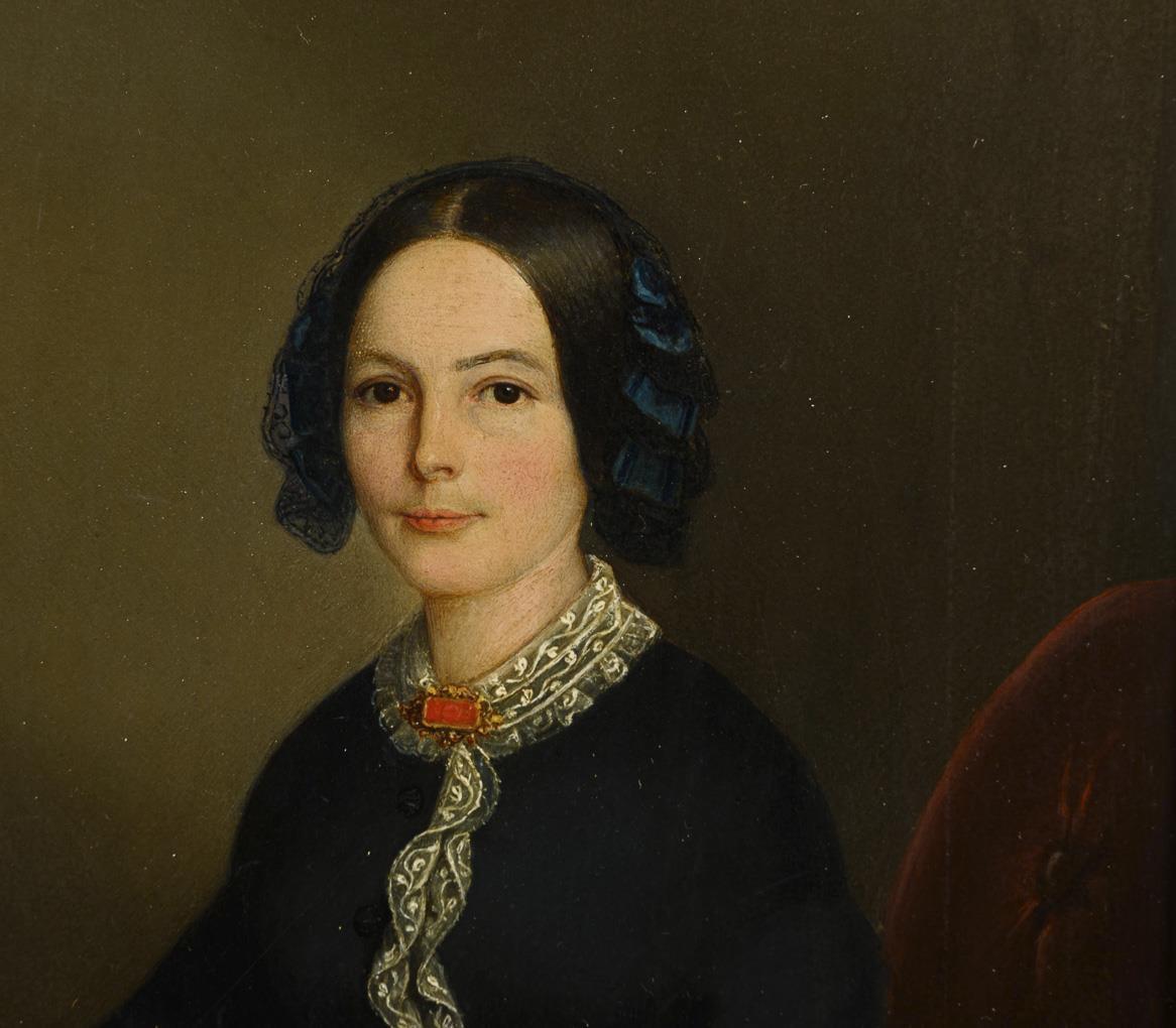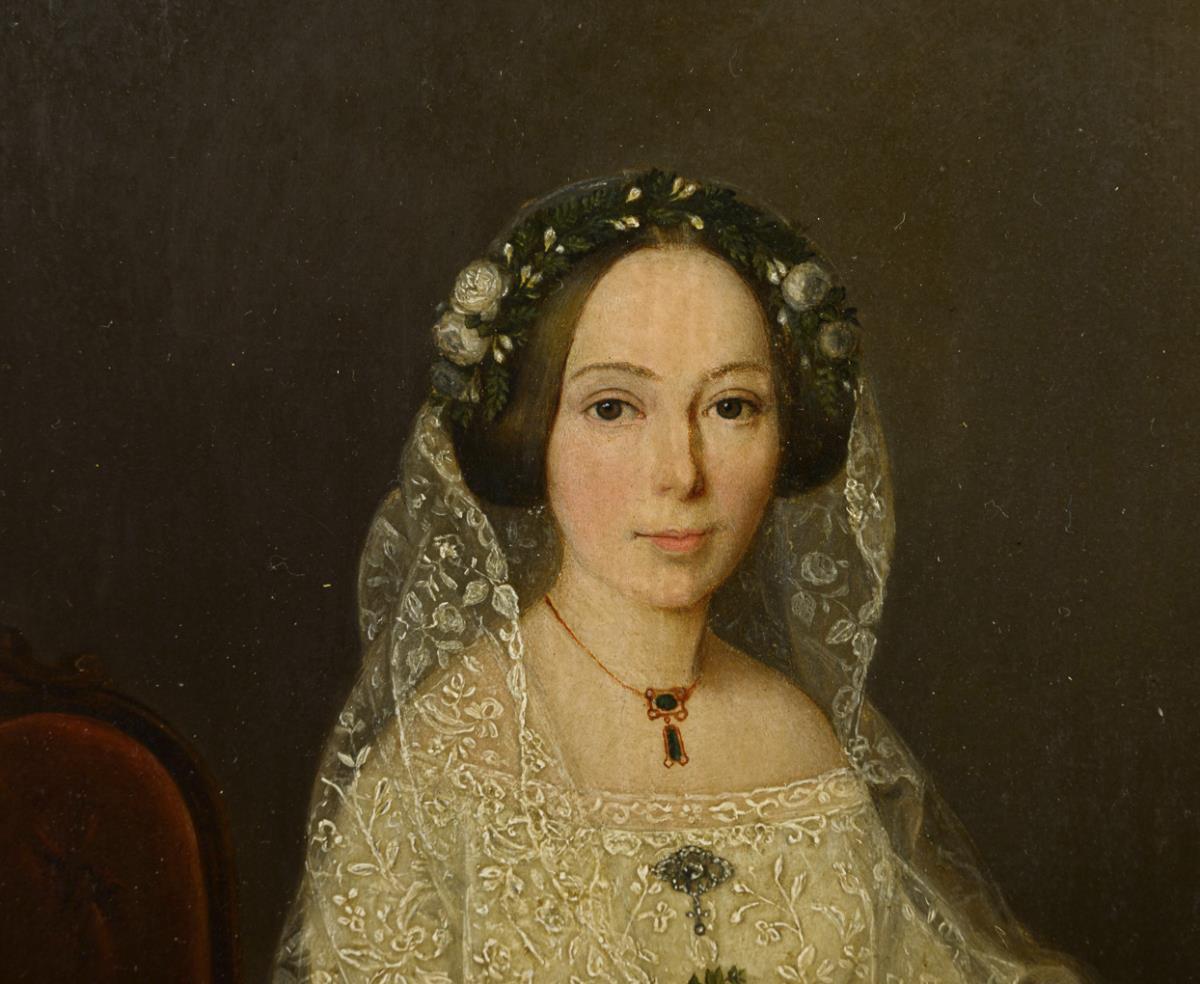 Portrait of Mrs. "Roth" as a lady in a dark dress with a blue ribbon in her hair and portrait of Mrs. "Roth" as a bride in a white dress with veil and wreath of flowers.