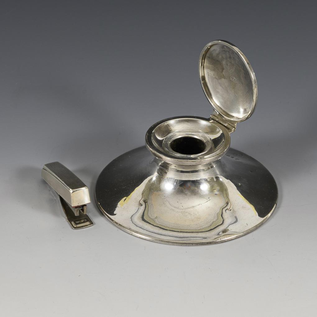 Round inkwell with glass insert and hinged lid (h 6 cm, Ø 14 cm). / Stapler with grooved decoration (L 7 cm). Inkwell with some dents.