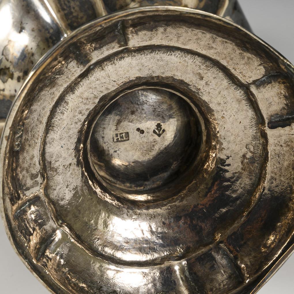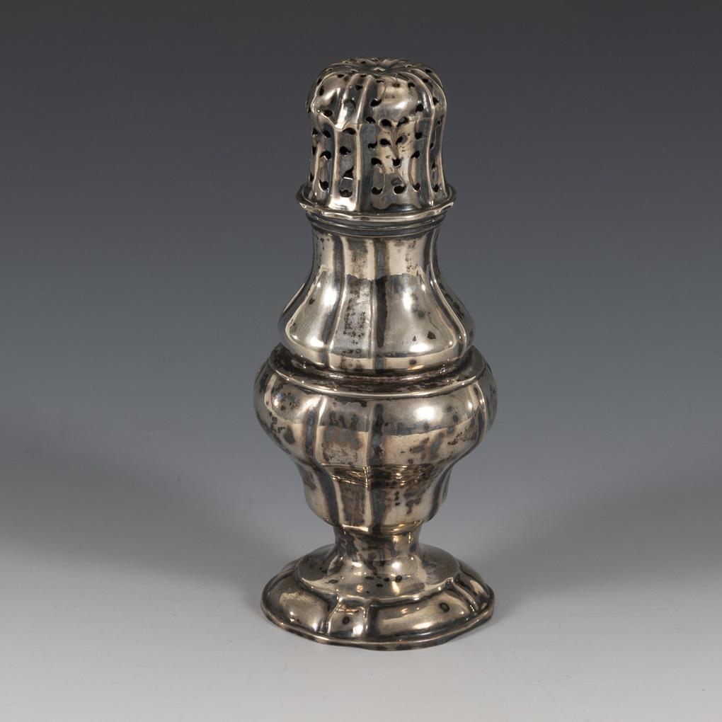 Baluster form with pierced plug lid. Heavily dented, lid knob missing.