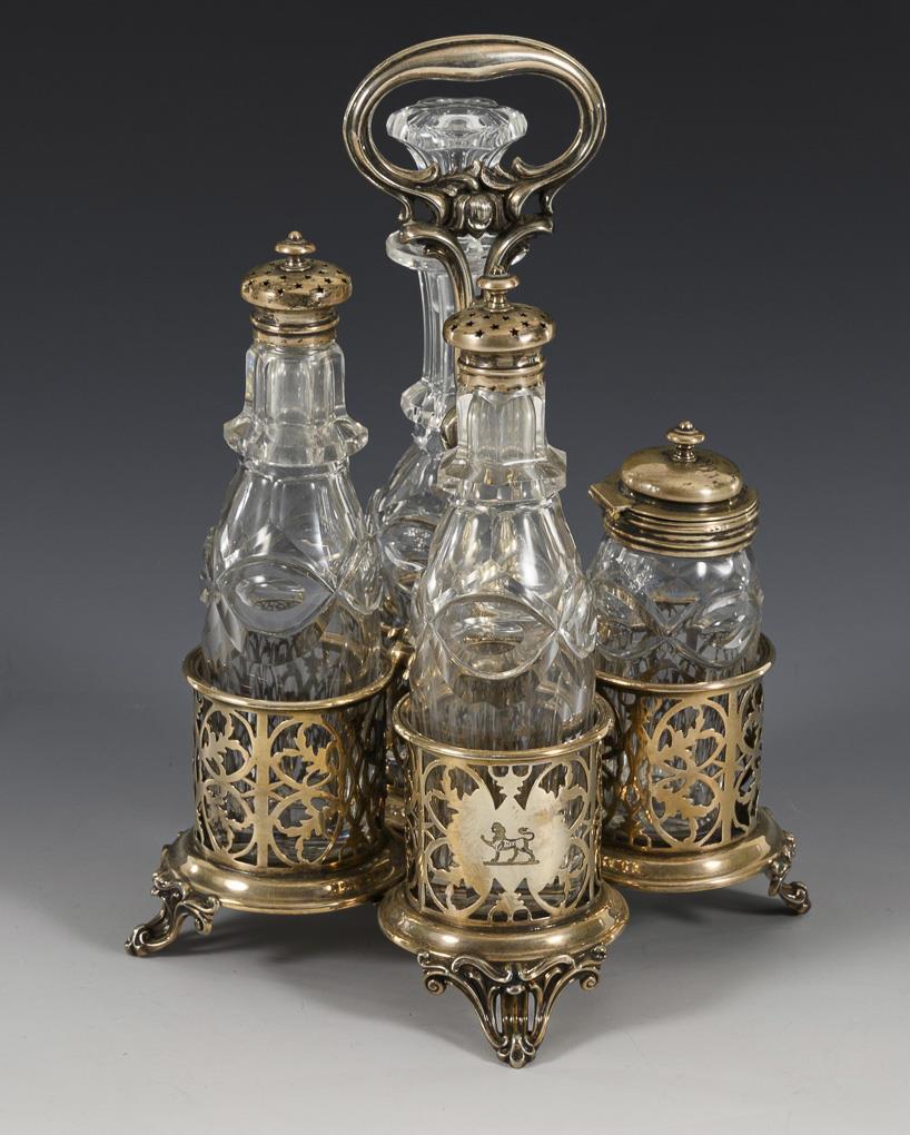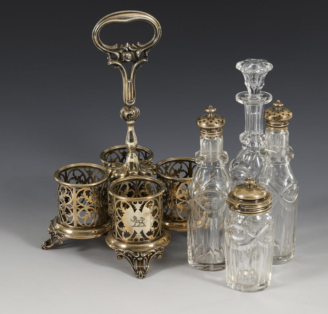 Silver plated cruet with 4 openwork holders and central ring handle. Comes with 4 matching, probably complemented clear glass bottles, 3 of them with silver lids (h 12 - 20 cm).