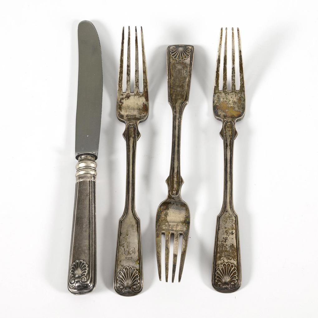 3 heavy Biedermeier silver forks and 1 knife, each with relief shell motif and crowned monogram engraving "ER". Knife with supplemented blade.
