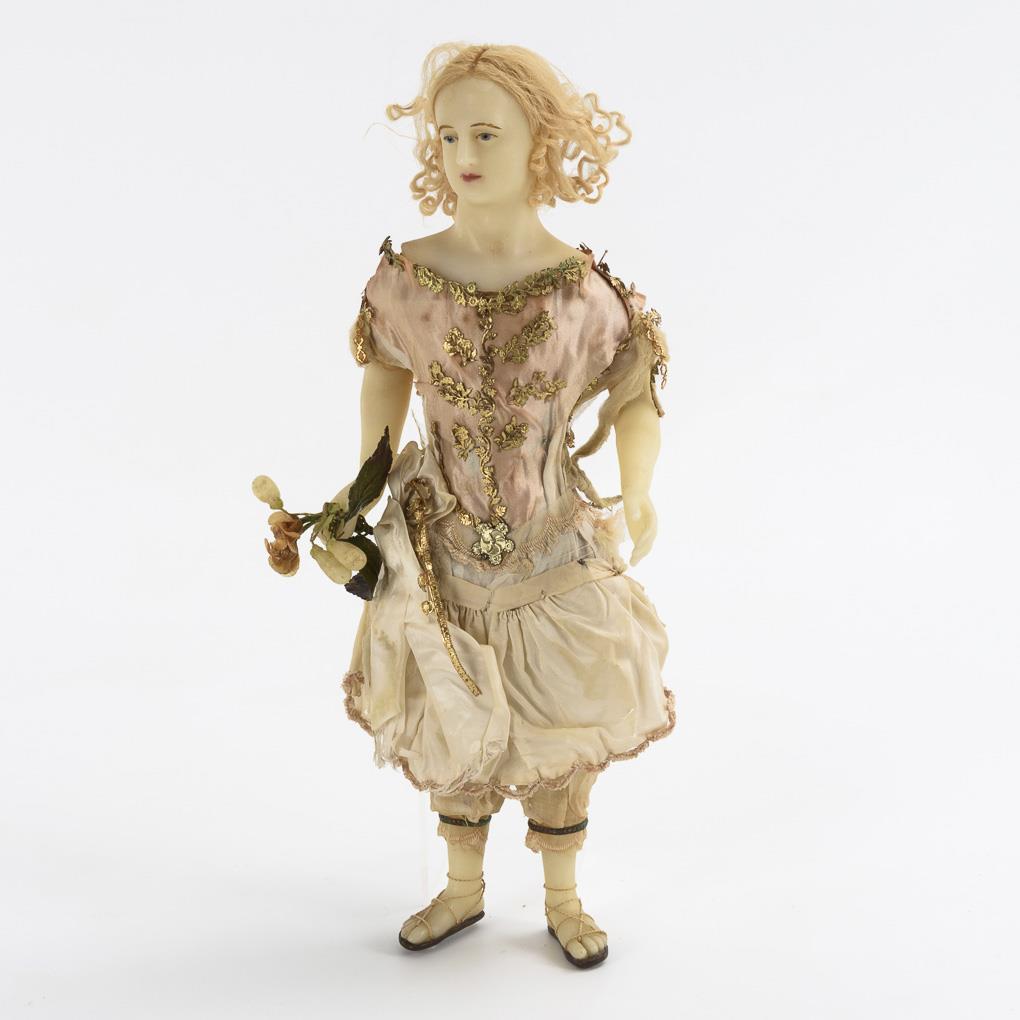 Possible Nativity figurine: chest head with inlaid blue glass eyes, blond flaxen hair, straw stuffed cloth body with wax links, light-colored clothing with embossed gold decoration of cardboard.