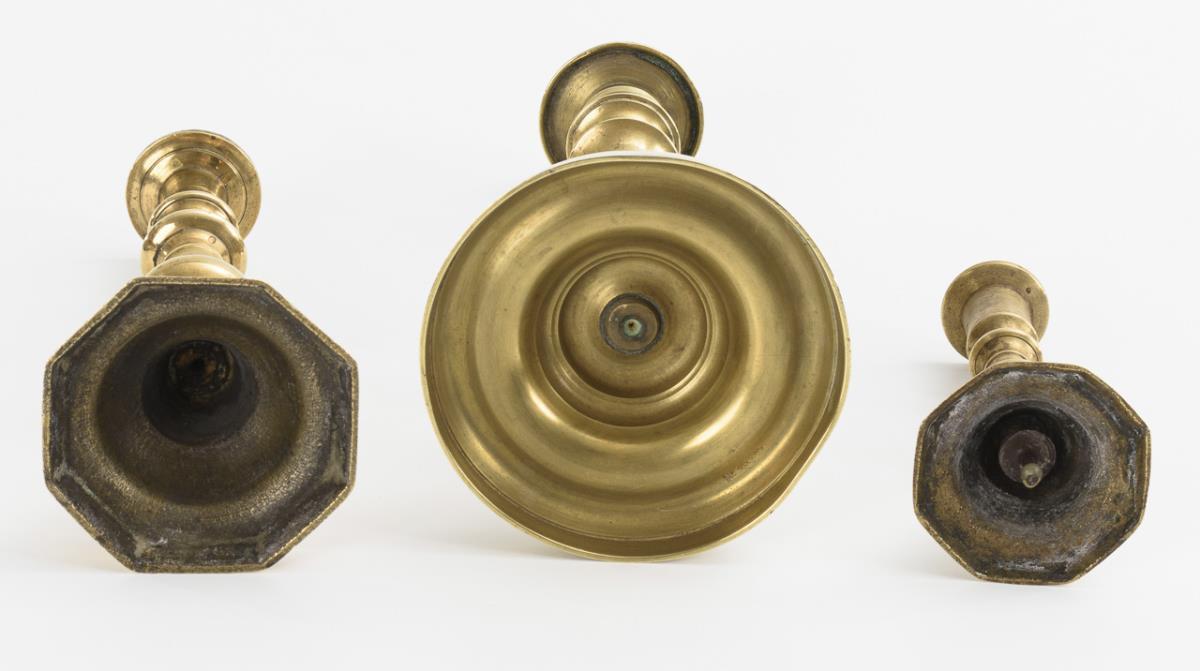 Various bronze candlesticks: 2x with octagonal foot, each with baluster stem, 1x with candle stump ejector in foot. Minimal signs of age/use.