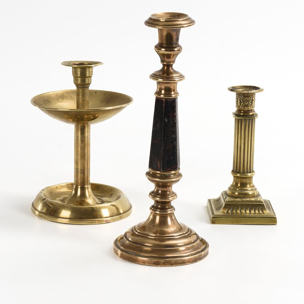 2x brass sheet, 1 stem iron lacquered, 1x bronze. H 16,5 - 27 cm.