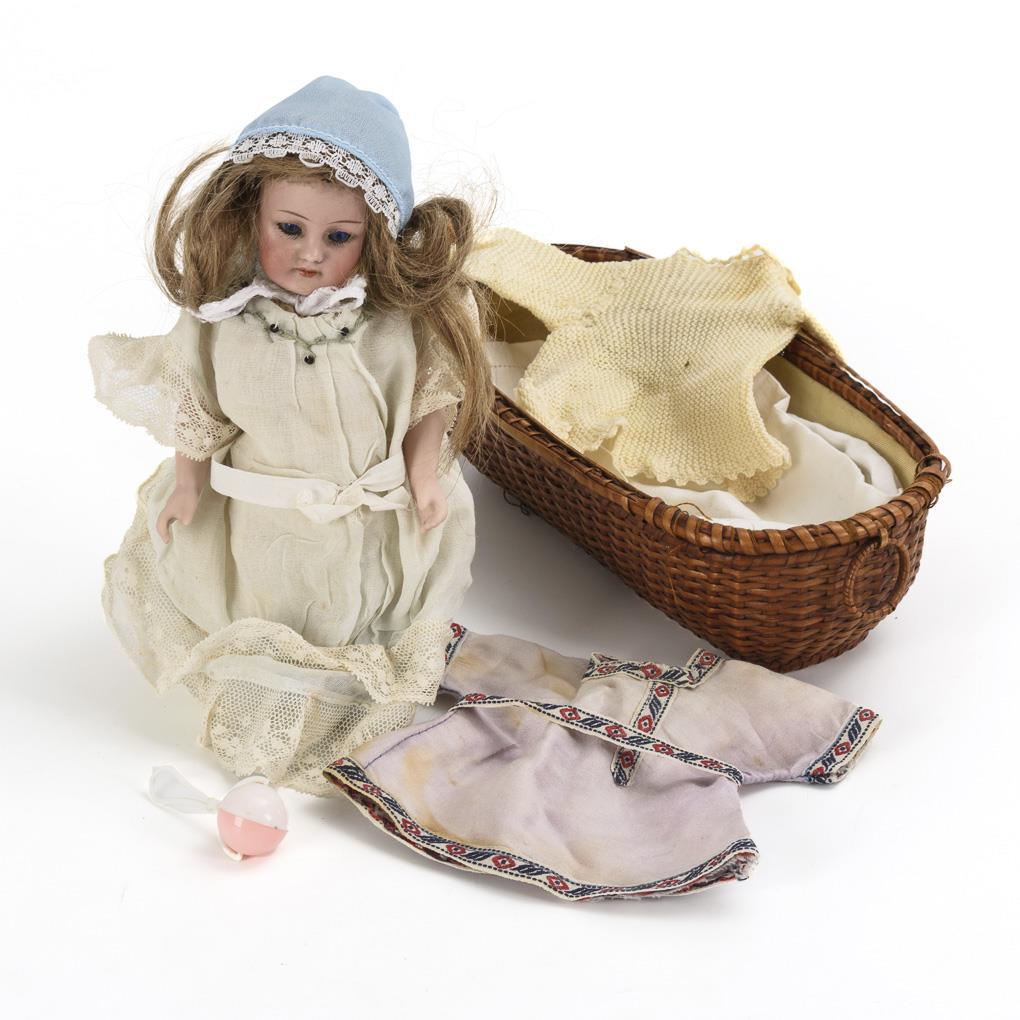 Crank head, blue sleeping eyes, pierced ears, dark blond human hair wig. Mass body with bisque limbs. White dress, modeled shoes and stockings, blue bonnet. L 17,5 cm. Comes with oval reddish-brown basket. Neck crank with defects. Signs of age.