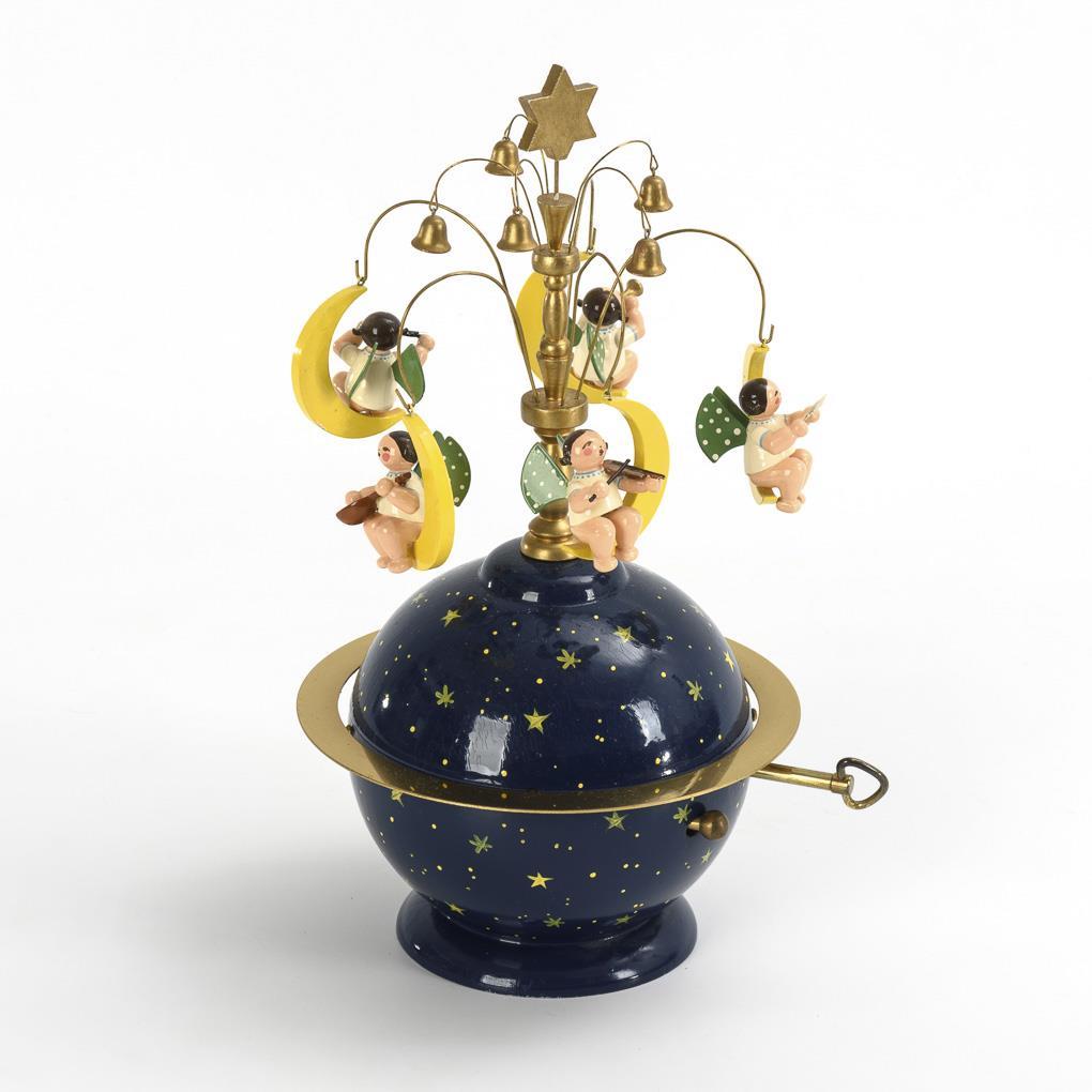 Musical box with stars and 5 angels sitting in the crescent moon. Plays "Silent Night". Scarcely used, movement intact.