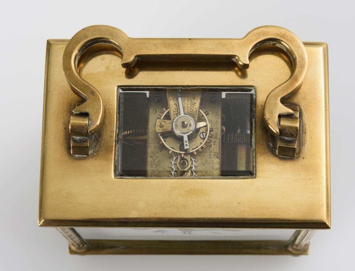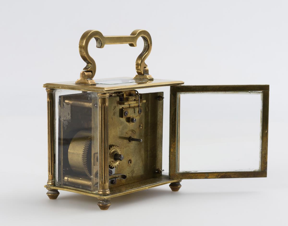 5-sided faceted glazed brass case with fluted corner pillars and curved carrying handle. Glass partially with defects.
