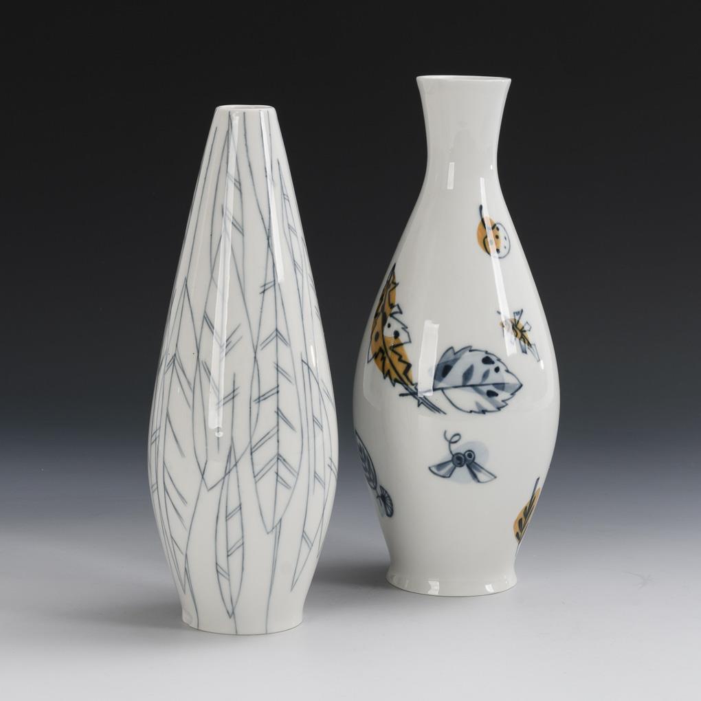 1x vase "Falling Autumn Leaves", form no. H 206, form design Hans Merz (1921-1987), decor design Heinz Werner (1928-2019) / 1x vase with stylized leaf pattern, form no. H 205. Each 1 bump on the stand.