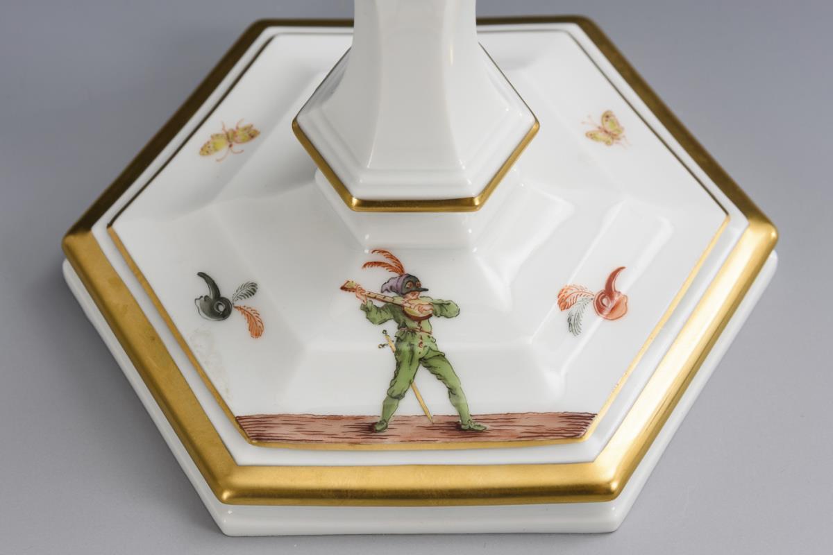 Hexagonal candlestick with multiple jointed shaft. Painted with motifs of the Commedia dell'arte.