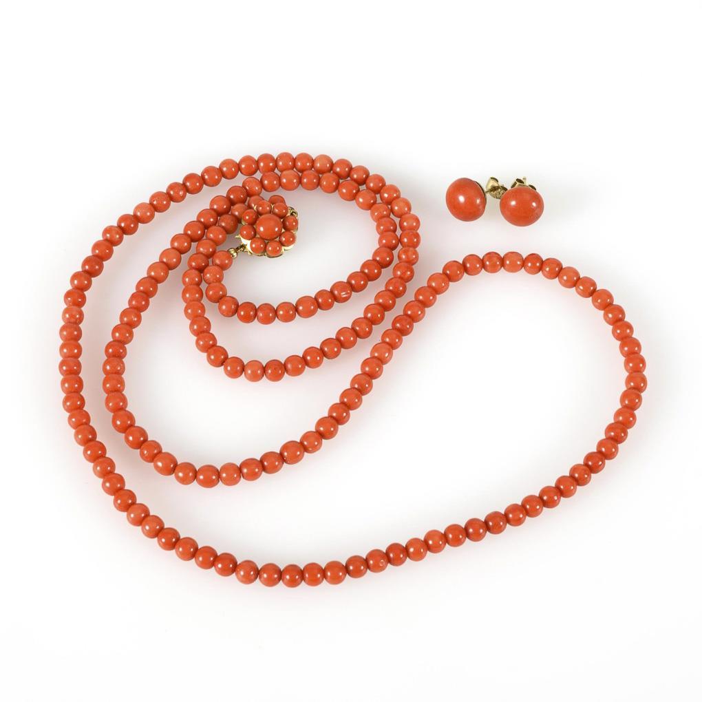Yellow gold clasp and pin mechanism 585 stamped. Coral Ø 5 mm. Chain L 84 cm. Stud earrings Ø 1.1 cm. 36,2/3,9 g.