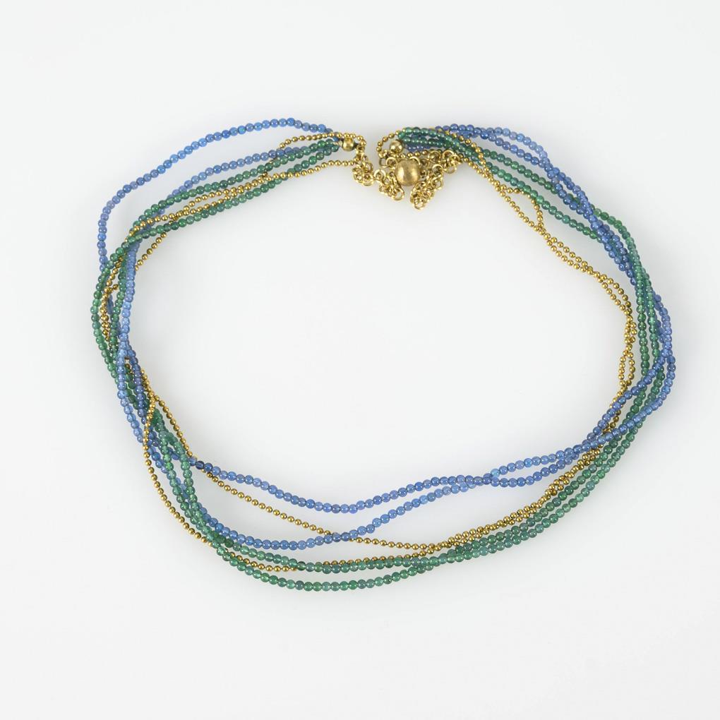 Lacing chains with small colored stone?- and yellow gold balls between short anchor chain with ball clasp.