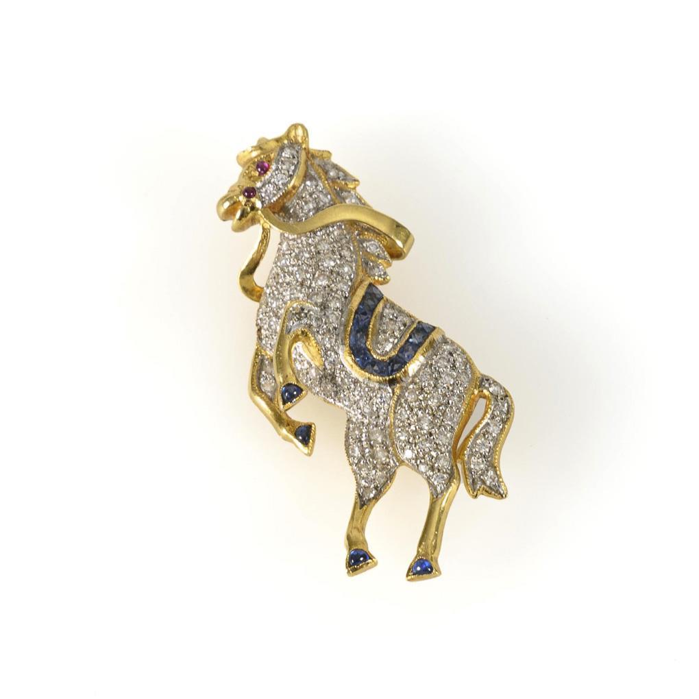 Sculpturally crafted brooch with pavé-set small diamonds, 14 sapphires and 2 rubies. Ball hook.