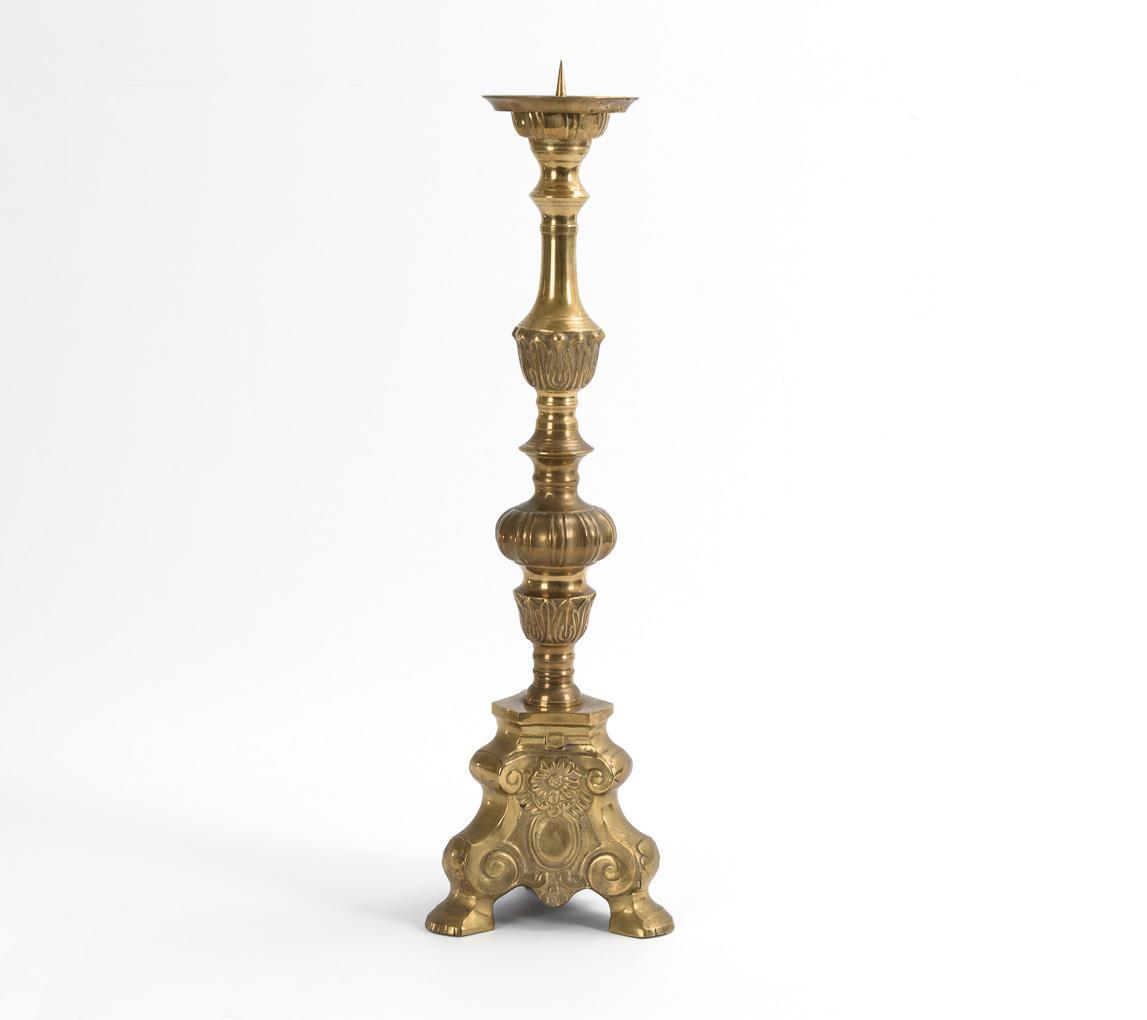 3-pass foot with volutes and empty cartouches and flowers. Multiple jointed baluster stem with foliate decoration as well as plain wax plate with brass spike.