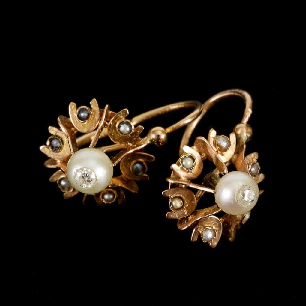 Flower brisure with small diamond in cultured pearl surrounded by seed pearls, on bail bar.