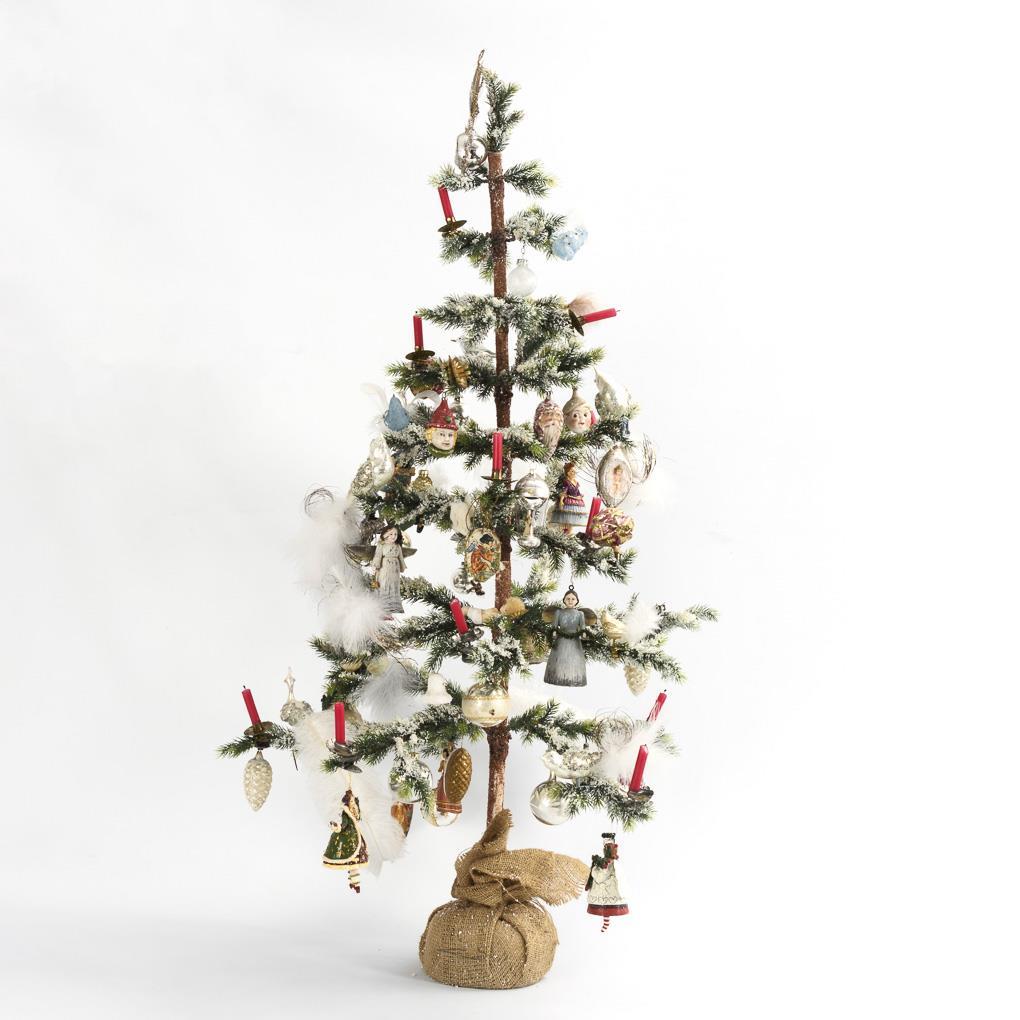Christmas tree with plastic needles, snow mica, glass hangings (balls and various birds), mass figures and red candles. In jute bag as a stand. Small defects.