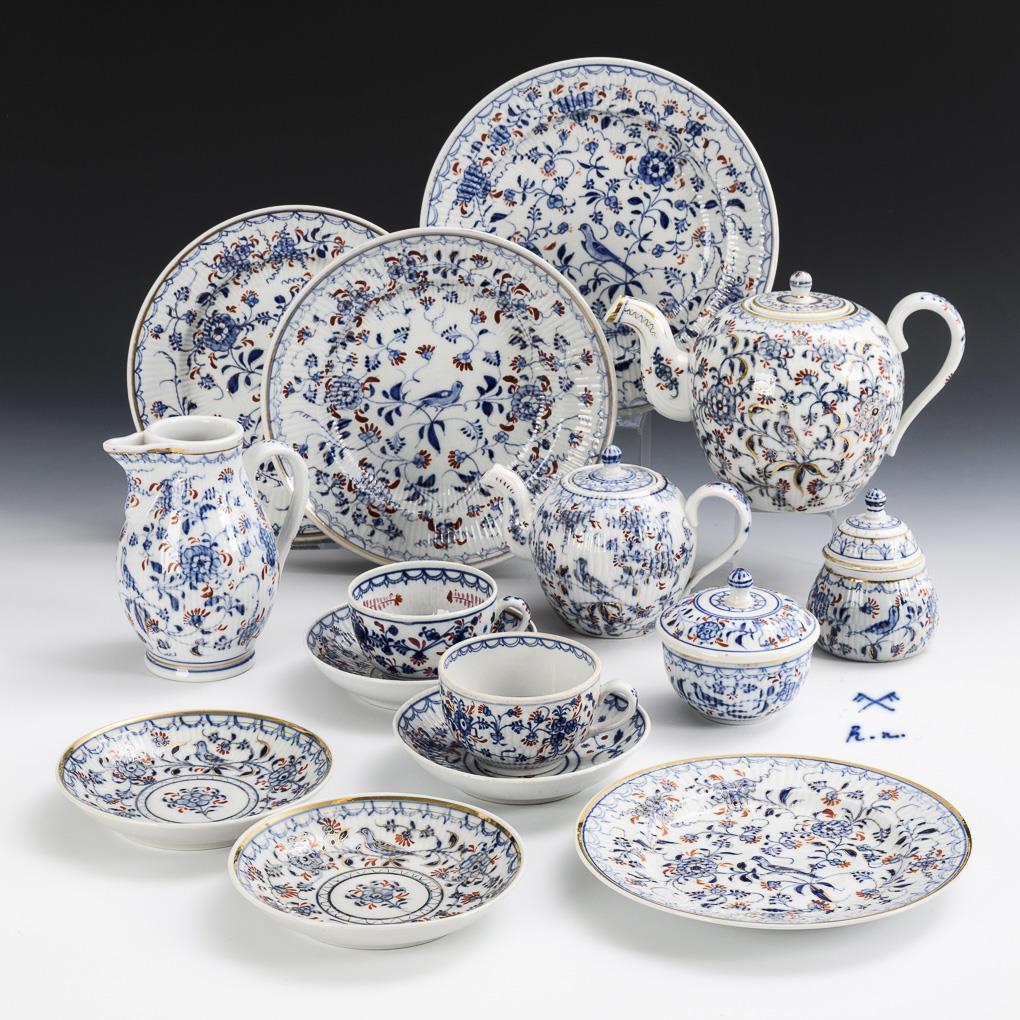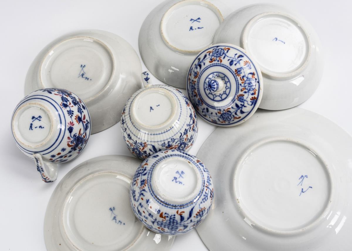 2 teapots (h 14.5 and 11 cm), 1 pear jug (without lid; h 14.5 cm), 2 different sugar bowls (h 8.5 and 9.5 cm), 2 cups, 4 saucers, 2 appetizer plates, 1 dinner plate and 1 breakfast plate. Partially rubbed, lid knob of a teapot restored.