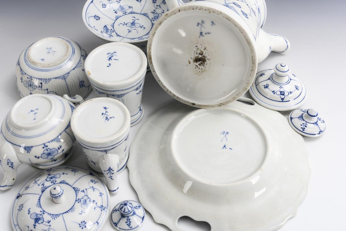 Mainly with the relief decoration "Broken stick". Coffee pot (H 24 cm), water jug (H 11.5 cm), milk jug, teapot (H 10.5 cm), 3 cups (H 5.5 cm) with 3 saucers (Ø 14.5 cm), credenza plate (Ø 25 cm), centerpiece (H 10 cm) and sugar bowl (H 11.5 cm). Hairline crack in 1 saucer.