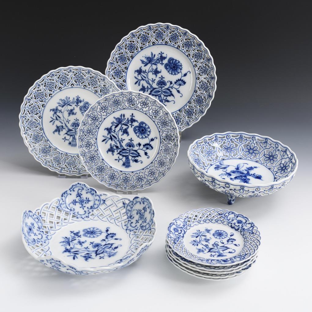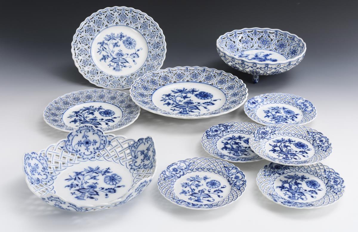 3 plates (Ø 20, 22 and 26 cm) and 1 round footed bowl (Ø 22 cm) with flower piercing, 5 plates (Ø 15 cm) and 1 round bowl (Ø 23,5 cm) with basket piercing.