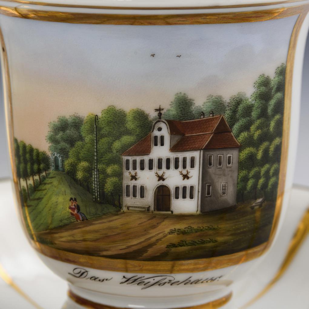 Footed bell cup with bird's head handle: on the outside the designated view of the former forest and hunting lodge in the city forest of Mulhouse. / In addition, a saucer with the also designated view of the White House. Hairline crack at the upper handle base.