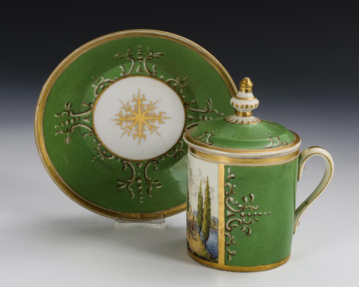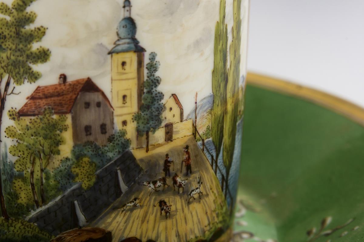 Cylindrical cup with ear handle, knob lid and original saucer. Green background, on the outside a rectangular cartouche depicting an alpine landscape with church, houses, figures and animals. Minimal gold abrasion.