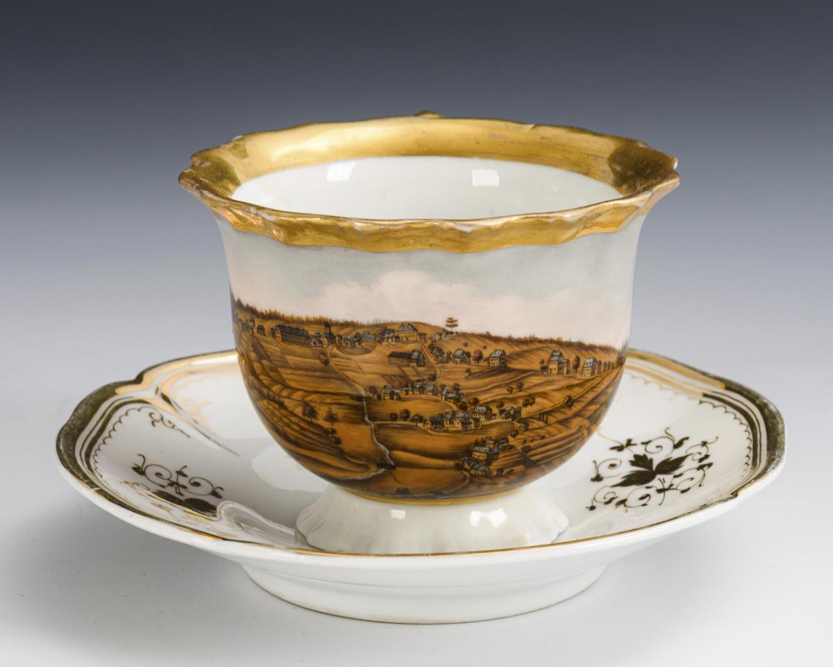 Footed bell cup with multi-pass rim and stand. On the front a gold-framed rectangular cartouche with the sepia-painted, map-like representation of a landscape divided by numerous fields and meadows with houses and people staffage. Foot restored as well as restored rim chip.
