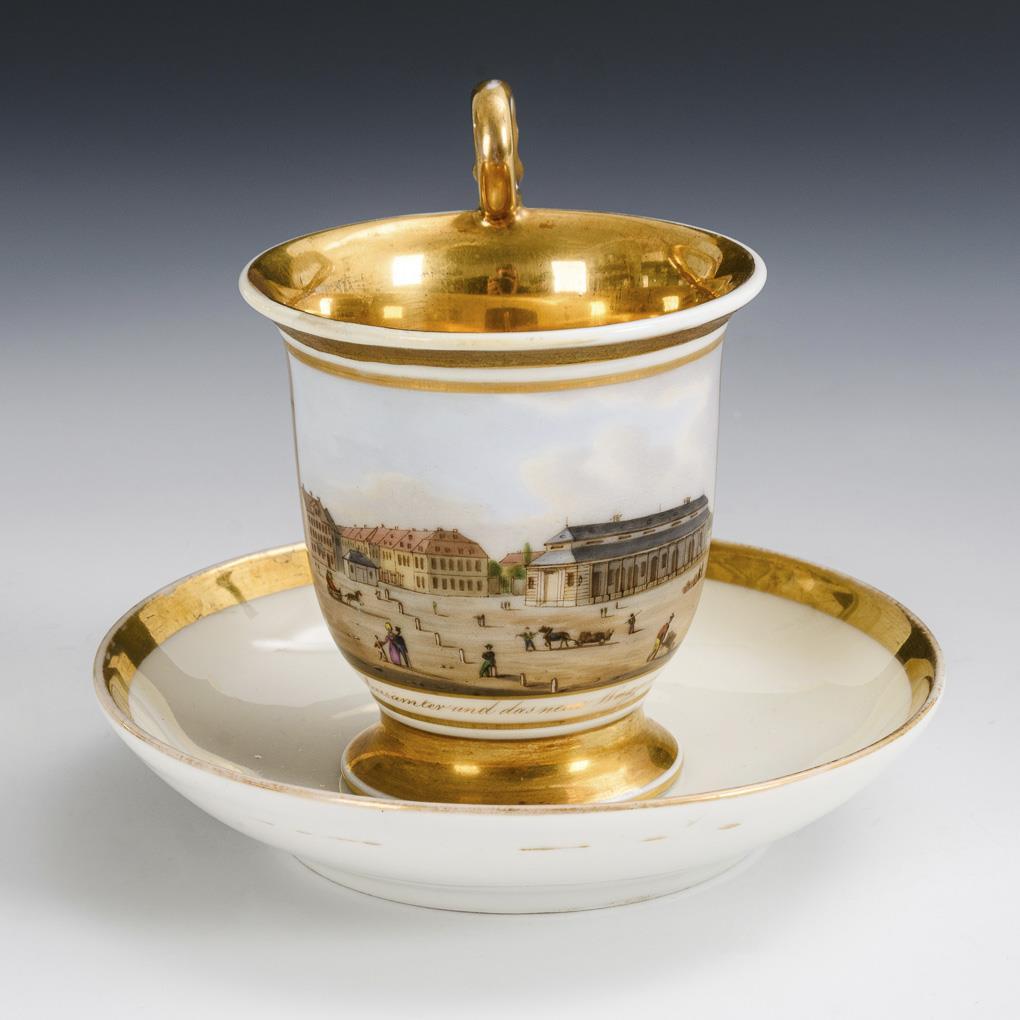 Footed bell cup with palmette handle. Gold background, on the outside a rectangular cartouche with the inscribed view of the Aczisehaus and the Libra building in Leipzig. Minimal gold abrasion, mouth rim restored, gold retouched on the rim.