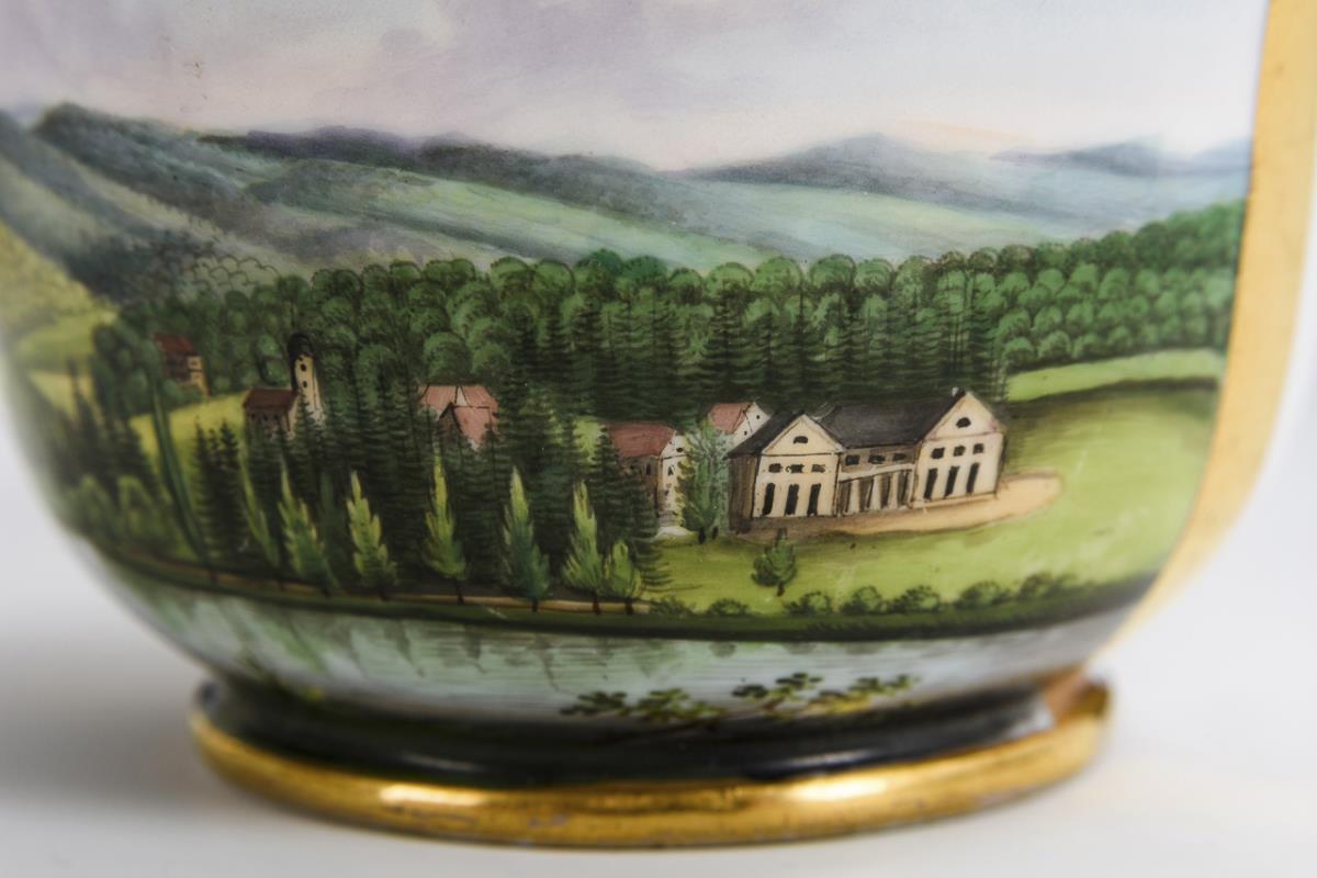 Bell-shaped cup with pointed curved handle. On the front a gold-framed rectangular cartouche with the view of the park and castle Wilhelmsthal near Eisenach. Gold rubbed.