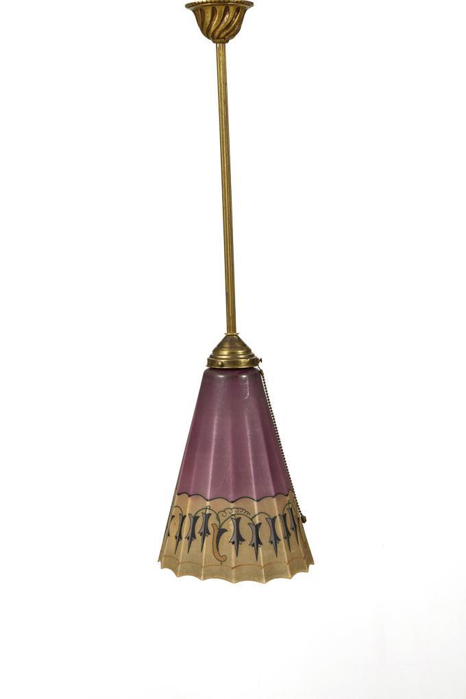 brass, frosted glass with printed ornament and purple color. H 75 cm, Ø 21 cm.