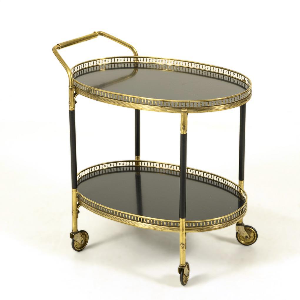 Wheeled tea trolley (so-called Desserte) made of brass frame with 2 oval shelves, decorated with balustrade. Metal with traces of corrosion, restored.